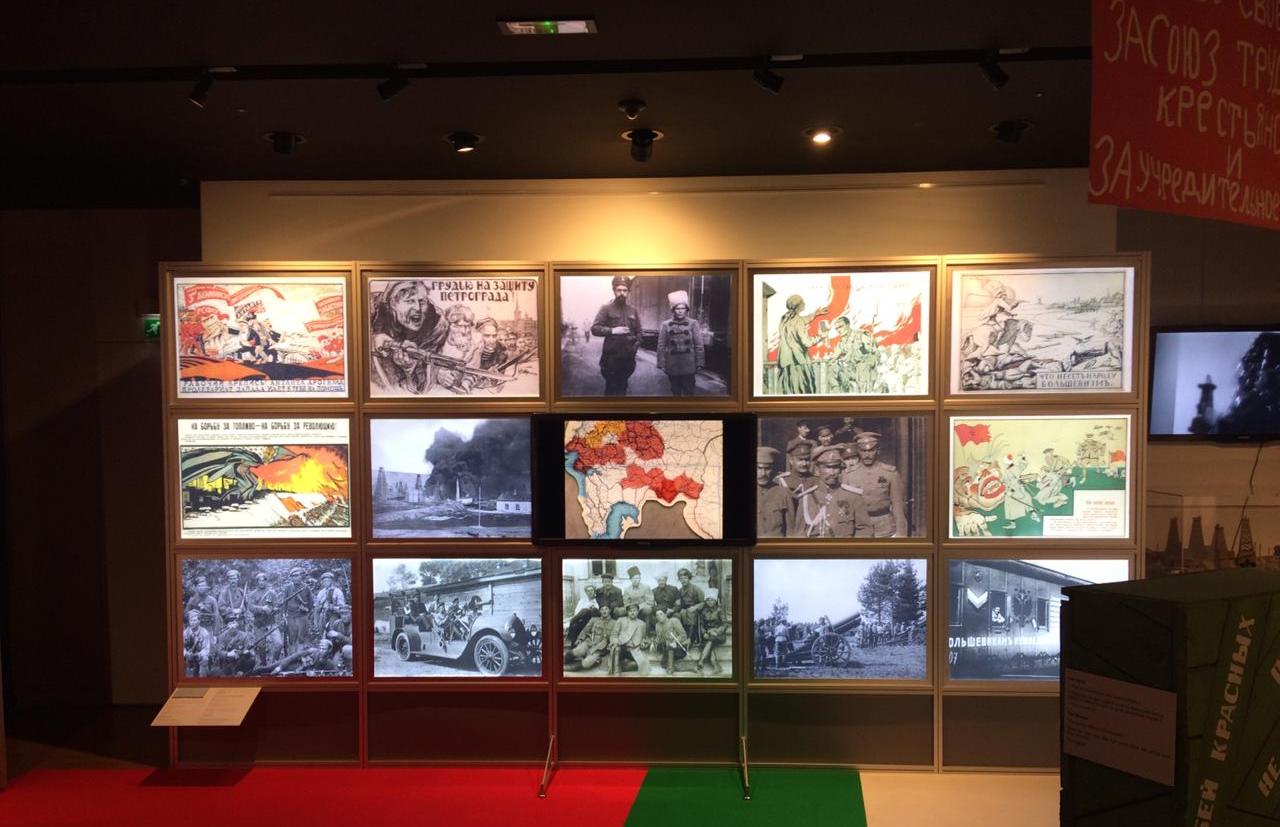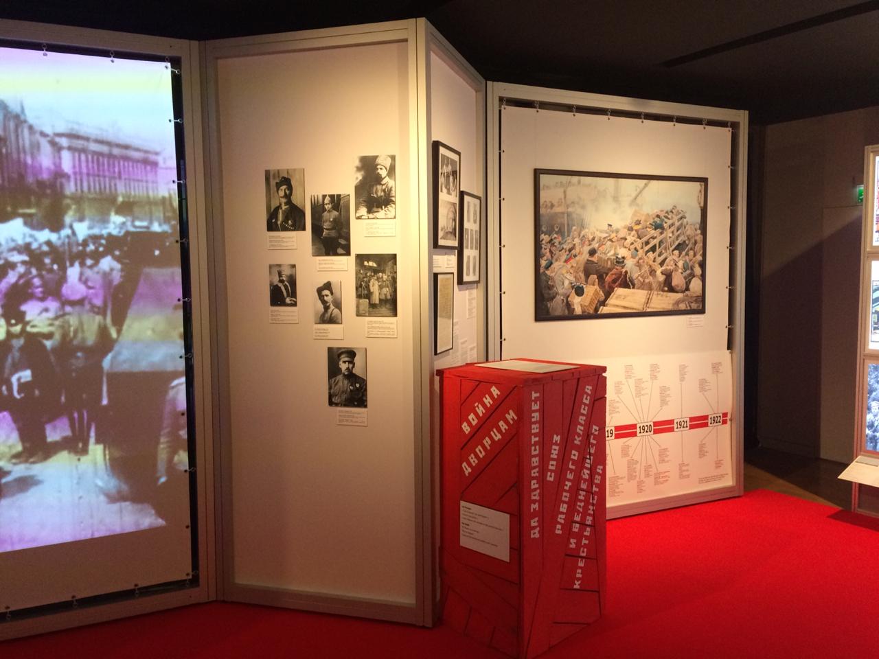 Драматическое напряжение событий столетней давности передано в соотношении трех основных цветов, разделяющих пространство выставки на тематические зоны. Неотъемлемой частью выставки являются специально разработанные мультимедийные программы, которые интегрированы в экспозиционное пространство и рассказывают о главных действующих лицах и событиях Гражданской войны в России.