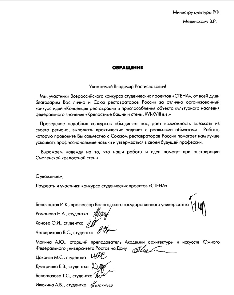 В адрес Председателя Российского военно-исторического общества, Министра культуры РФ Владимира Мединского поступило письмо от участников и лауреатов Всероссийского конкурса студенческих проектов «Стена», которые выразили благодарность за организацию творческого соревнования.