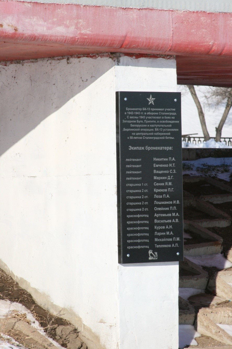 На набережной города-героя Волгограда в память о моряках-защитниках Сталинграда установлен бронекатер БК-13. Его экипаж в составе Волжской военной флотилии участвовал в обороне легендарного Сталинграда с 24 июля по 17 декабря 1942 года. По окончании битвы бронекатер по рекам Европы дошел до Берлина и участвовал в его штурме, затем вернулся в Сталинград. У катера-памятника часто проводятся памятные мероприятия, в которых принимают участие ветераны Великой Отечественной войны, молодые моряки и морские пехотинцы, курсанты.