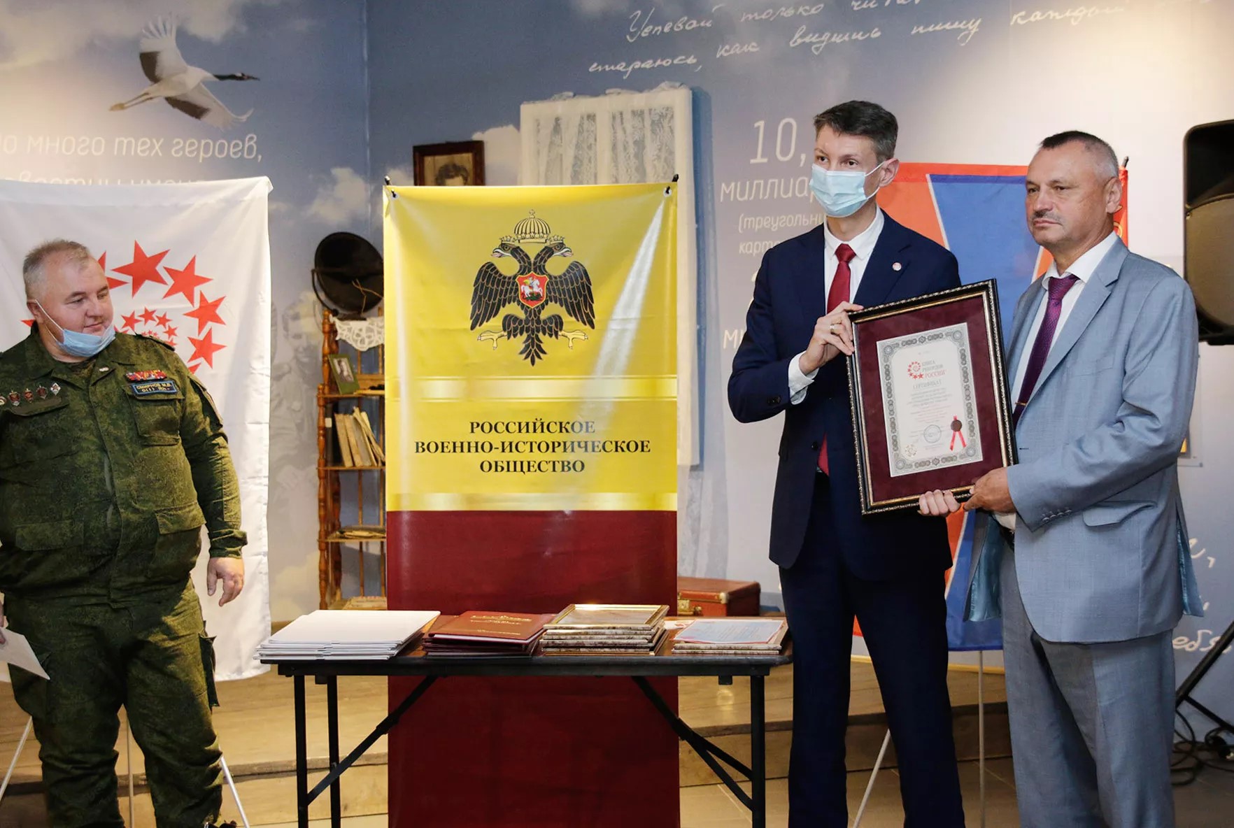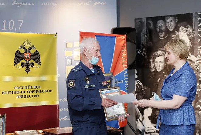 Главный редактор Книги рекордов России Станислав Коненко вручил сертификат рекордсмена за наибольшее количество интернет-подключений при проведении регионального Урока мужества в стране председателю регионального отделения Российского военно-исторического общества Александру Потапенко.