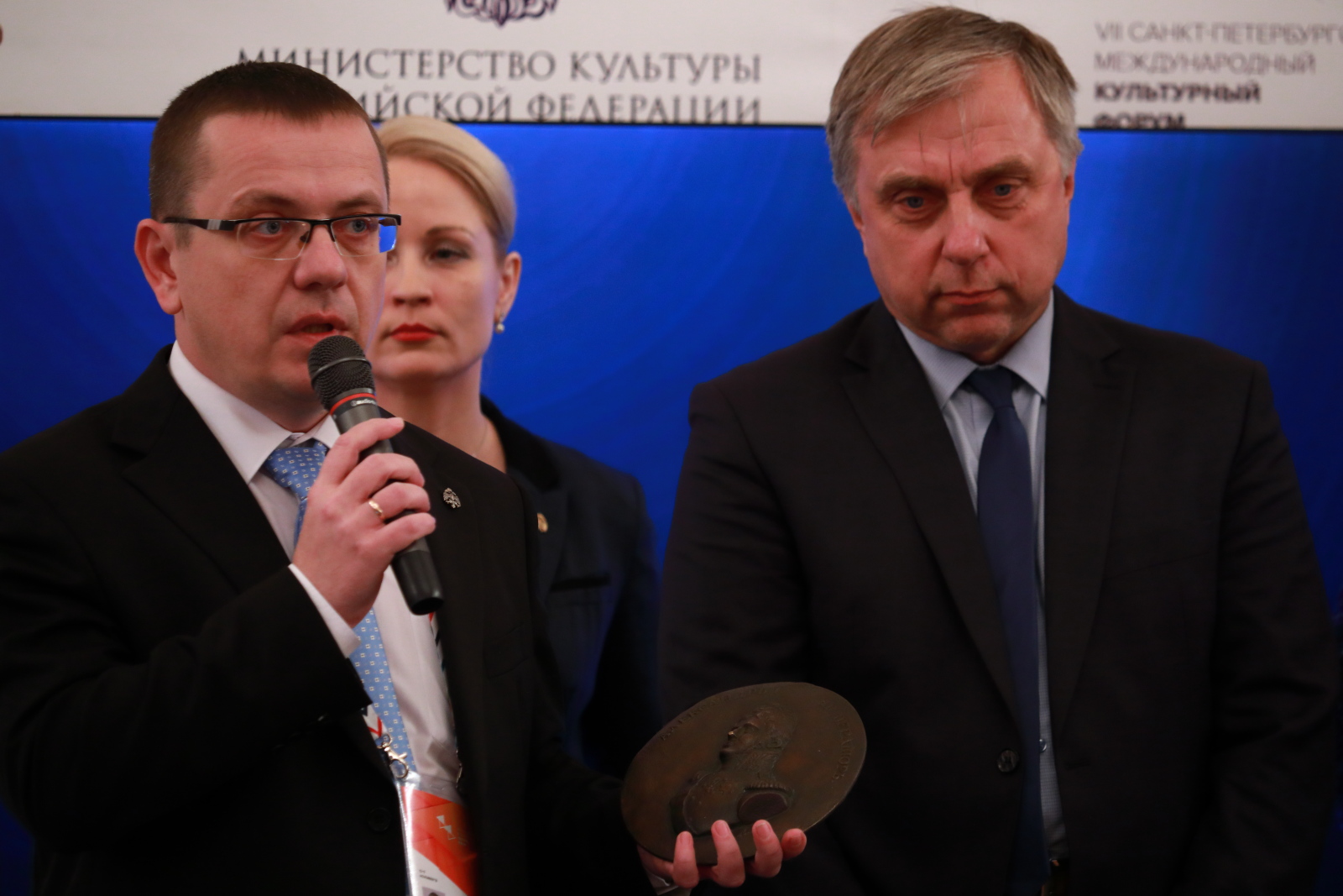 Экспонат передан Директором Департамента музеев Министерства культуры РФ Владиславом Кононовым руководителю Музея-заповедника «Царское село» Ольге Таратыновой.
