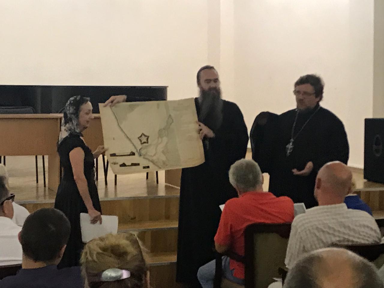 Членам общества были представлены редкие архивные документы о крепости, которая была построена в 1837 году на правом берегу реки Мзымта после победы в Русско-Турецкой войне 1828-1829 гг., положив тем самым точку отсчёта новой истории Адлерского района. По итогам Крымской войны, командование Русской императорской армии было вынуждено взорвать стены не только этой крепости, а и других крепостей на Черноморском побережье Кавказа. Личный состав гарнизонов был эвакуирован на судах в более безопасные места. После этих трагических событий, крепость Святаго Духа в Адлере уже не восстанавливалась.