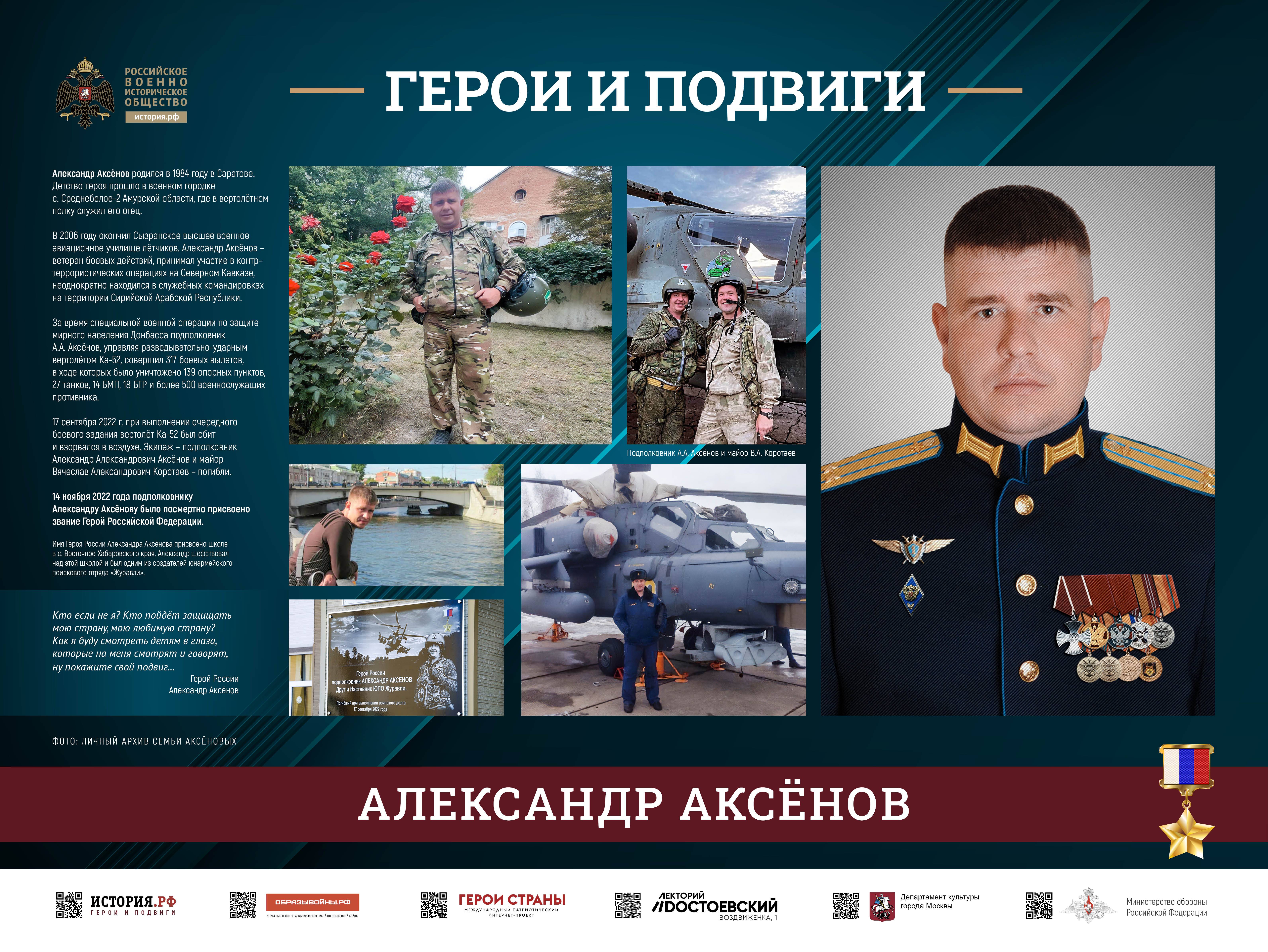 День для открытия памятной доски был выбран не случайно. Ровно два года назад, 17 сентября 2022 года, подполковник Аксёнов совершал вылет на вертолёте КА-52 в качестве ведущего авиационной группы. В ходе выполнения боевого задания группой были уничтожены несколько единиц бронетехники противника, но вертолёт был сбит и взорвался в воздухе. Экипаж погиб. 14 ноября 2022 года подполковнику Александру Аксёнову было посмертно присвоено звание Герой Российской Федерации.
