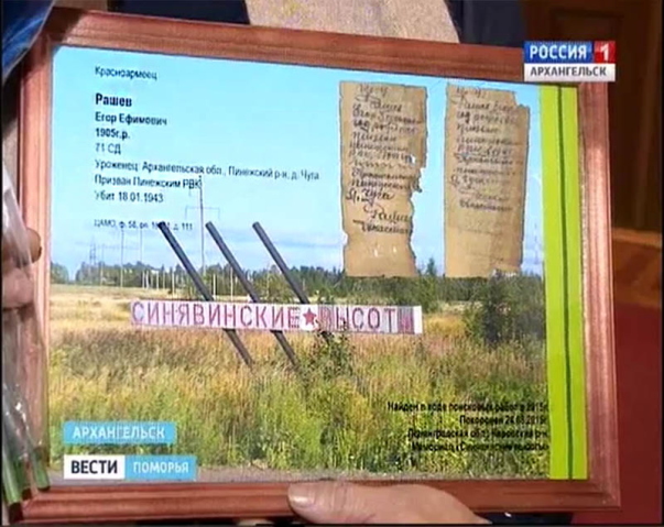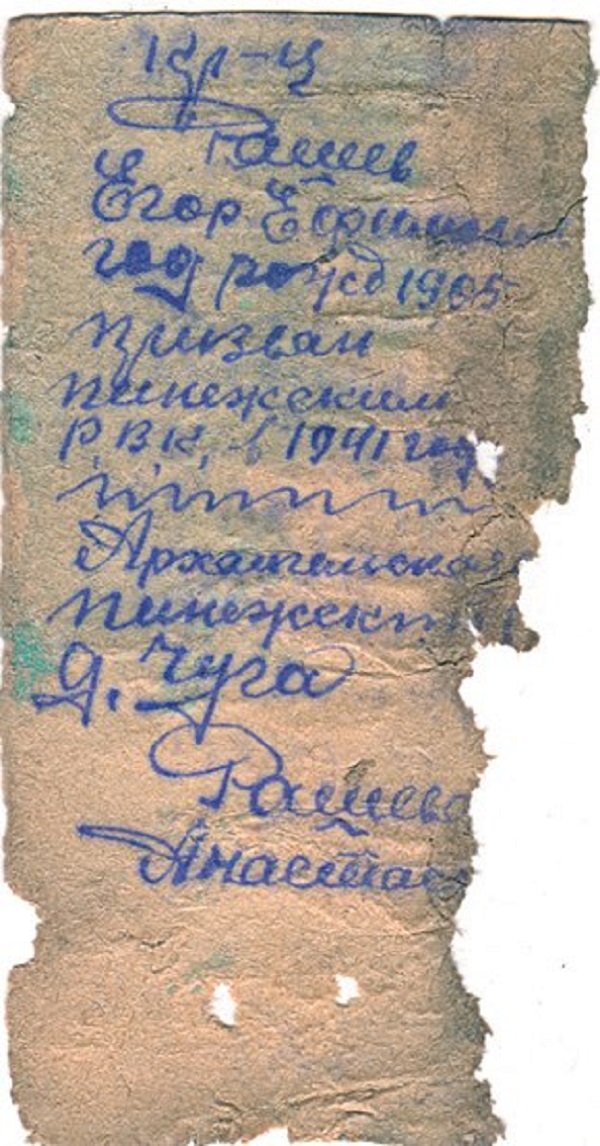 Уроженец деревни Чуга Архангельской области Егор Рашев был убит в январе 1943 года при обороне Ленинграда. Его останки обнаружили поисковики в ходе работ в рамках военно-исторического лагеря «Волховский фронт». Записка в медальоне была написана от руки, без бланка, но сохранилась довольно хорошо. Специалисты прочитали фамилию, имя, год и место рождения и место призыва солдата. Удалось найти семью Егора Ефимовича: до сих пор жива его дочь Анна Егоровна. Помогли в поисках сотрудники архива Холмогорского района области. Родные считали бойца пропавшим без вести – с 1942 года они ничего о нем не знали.