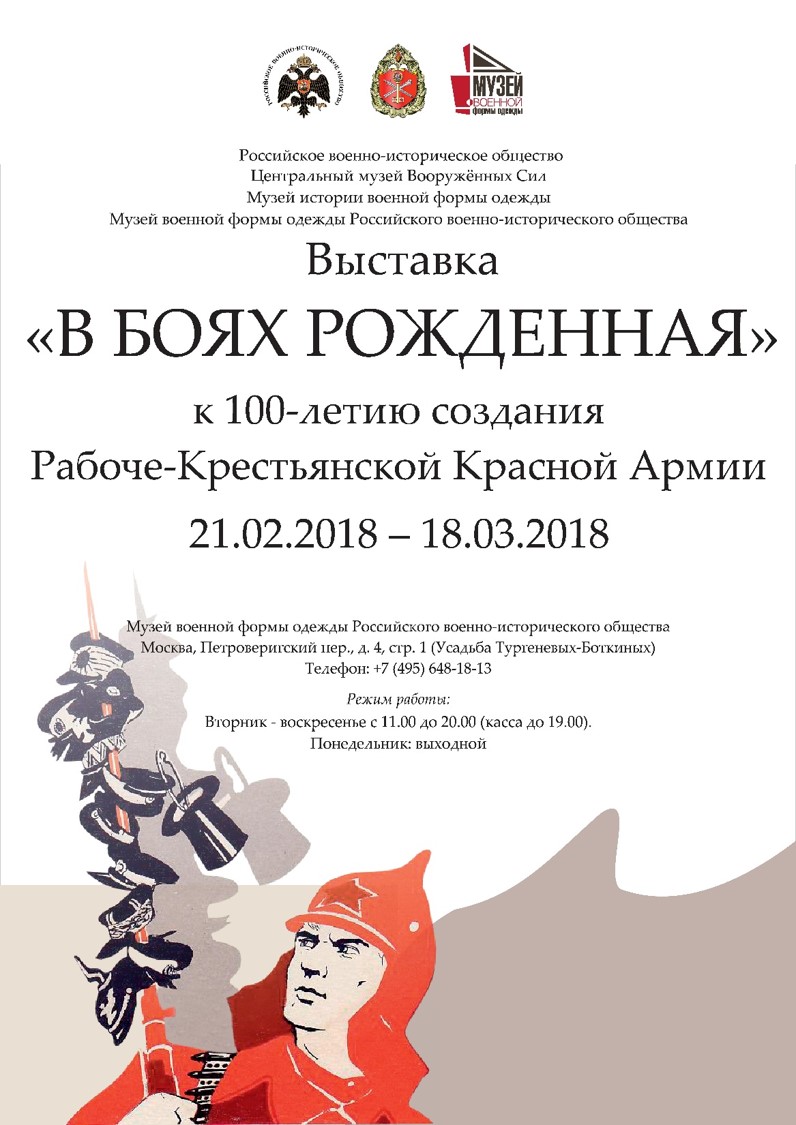 21 февраля 2018 года Музей военной формы одежды РВИО (Москва, Петроверигский переулок, дом 4, стр. 1) открывает выставку «В боях рожденная» – к 100-летию создания Рабоче-Крестьянской Красной Армии.