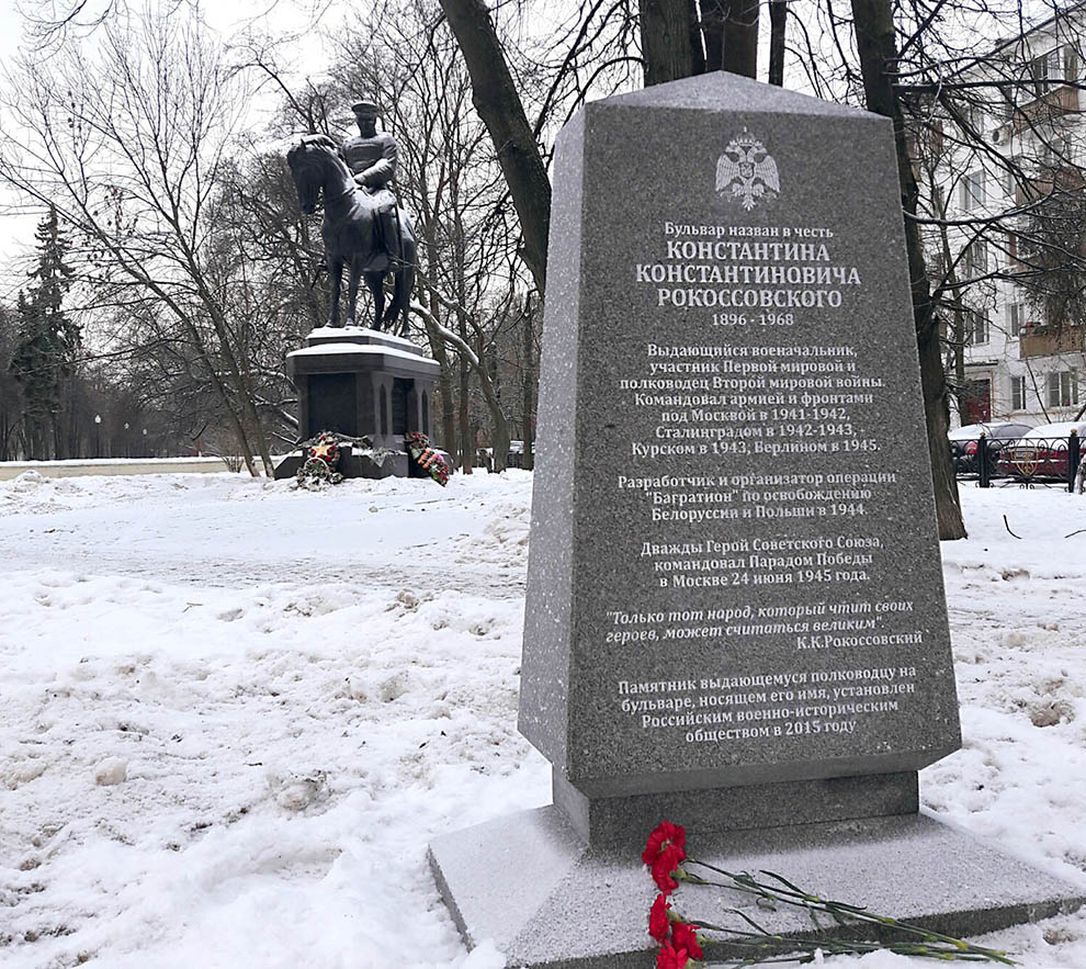 Напомним, что в 2015 году к 70-летию Великой Победы на бульваре Маршала Рокоссовского (в сквере между домами 11 и 12) РВИО был установлен памятник полководцу. Скульптура создана по проекту Александра Рукавишникова и архитекторов Сергея Шарова и Михаила Корси. В церемонии ее открытия приняли участие: Председатель Правительства РФ Дмитрий Медведев; Мэр Москвы Сергей Собянин; Председатель РВИО, Министр культуры РФ Владимир Мединский. По результатам голосования в «Активном гражданине» памятник был признан лучшим монументом, установленным в Москве в 2015 году.