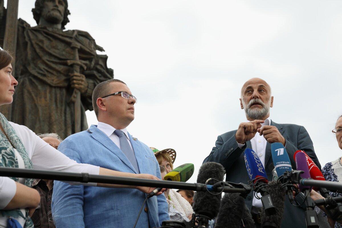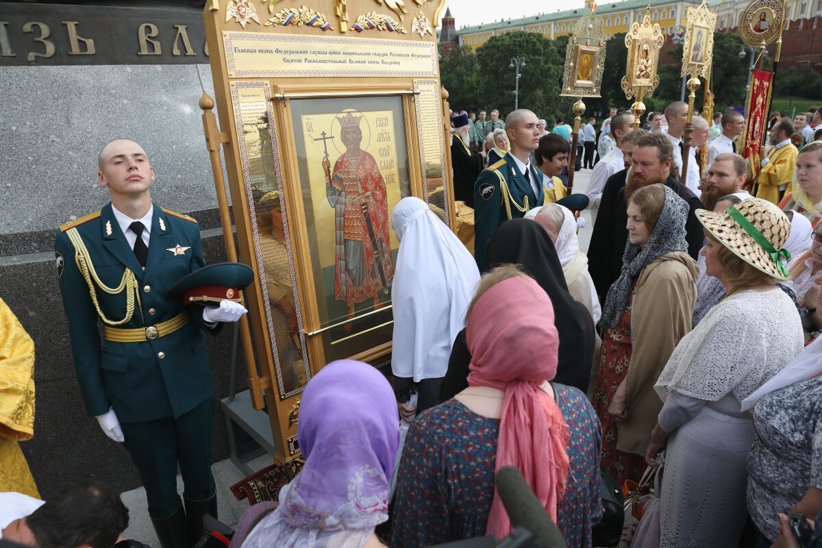 После завершения литургии прошел крестный ход к памятнику святого князя Владимира, у подножия которого состоялся молебен. Молитвенную радость разделили несколько сотен жителей и гостей столицы, представители Росгвардии и Российского военно-исторического общества. После окончания молебна все желающие смогли подойти к иконе святого Владимира и остаться на лекцию с рассказом о личности Великого князя и истории создания памятника.
