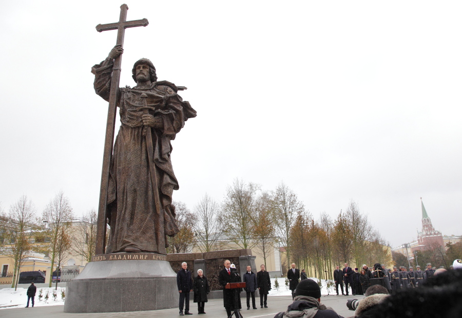 - Приветствую вас и поздравляю с открытием памятника святому равноапостольному князю Владимиру. Это большое, значимое событие и для Москвы, и для всей нашей страны, и для всех российских соотечественников. Символично, что оно проходит в День народного единства и именно здесь, в центре столицы, у стен древнего Кремля, в самом сердце России. Новый памятник – дань уважения нашему выдающемуся предку, особо почитаемому святому, государственному деятелю и воину, духовному основателю государства Российского – сказал на торжественной церемонии открытия Президент России Владимир Путин.