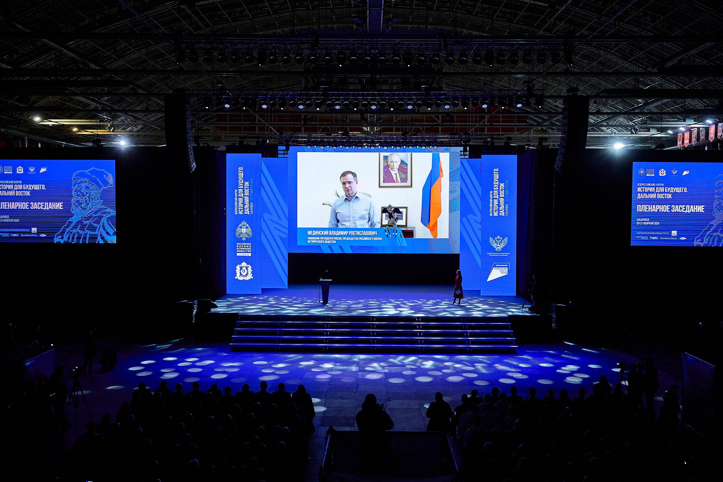 – История Дальнего Востока и его освоения – это история невероятного труда и подвига. На скрижалях нашей истории имена пионеров, первопроходцев, выдающихся россиян – Дежнева и Хабарова, Невельского, Муравьева-Амурского, сотен и тысяч наших соотечественников. И сегодня все внимание приковано к Дальнему Востоку, к месту, которое не случайно Президент называл нашим приоритетом в развитии на весь XXI век. Хотя в зале присутствуют местные, в основном, хабаровчане, представители регионов Дальнего Востока, но онлайн к вам подключены школы, институты, исторические сообщества со всей России, - сказал Владимир Мединский.