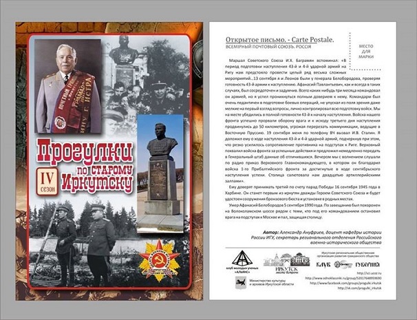 Жизнь и воинские подвиги дважды Героя Советского Союза, генерала армии Афанасия Белобородова стали темой очередной образовательной встречи проекта «Прогулки по старому Иркутску», организованной при поддержке Иркутского регионального отделения РВИО.