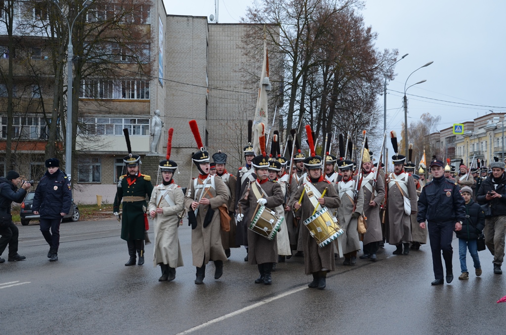 В завершение торжественной части праздника строем по улицам города прошли участники военно-исторической реконструкции - представители клубов из Калуги, Москвы, Екатеринбурга, Санкт-Петербурга, реконструкторы из Белоруссии и Франции. Всего в шествии приняли участие порядка 300 пеших воинов и около 40 кавалеристов.