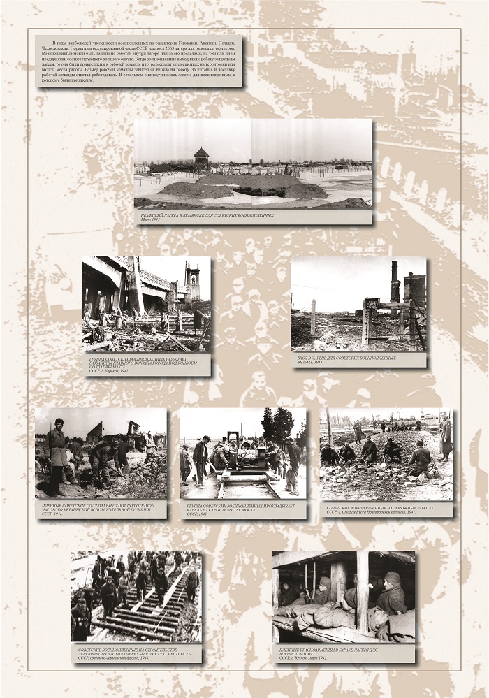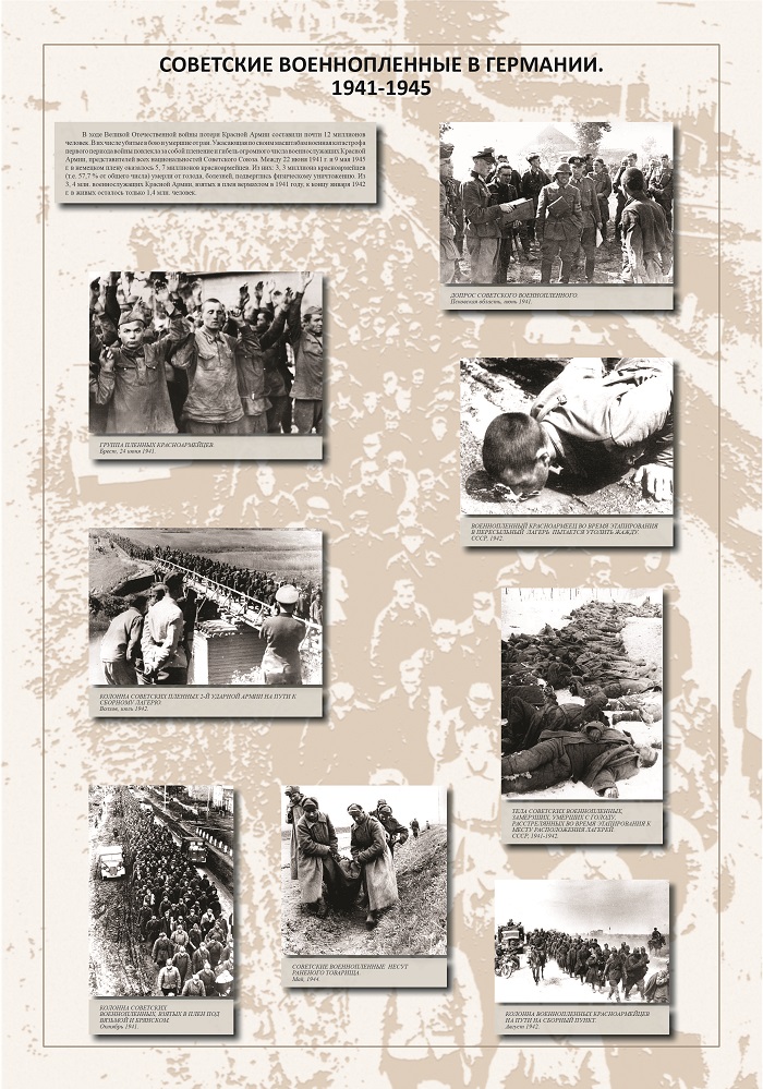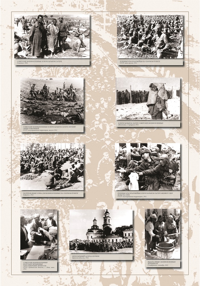 Военнопленных гитлеровцы сгоняли в огромные лагеря без каких-либо условий существования, где от голода съедалось все – трава, кора, корни деревьев, трупы животных. В нацистских лагерях погибло свыше 3 млн. советских военнопленных, то есть больше половины. Из 3,4 млн. военнослужащих Красной Армии, взятых в плен вермахтом в 1941 году, к концу января 1942 г. в живых осталось только 1,4 млн. человек. 2 миллиона погибли в первый же год войны. После Холокоста советские военнопленные составили вторую по численности группу жертв нацизма.