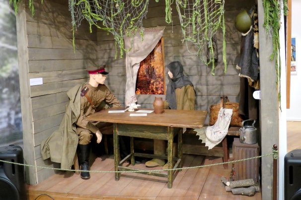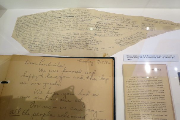 Впервые в одном зале собраны экспонаты со всей России, рассказывающие о героизме советских женщин: письмо 20-летней партизанки Ольгой Ржевской, написанное матери карандашом на косынке перед казнью; шкатулка для рукоделия и довоенное фото Зои Космодемьянской, свадебное платье из трофейных немецких бинтов.