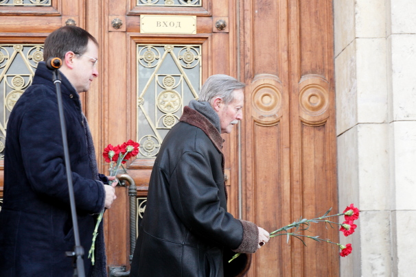 Несмотря на мороз, на церемонии открытия памятного знака, кроме друзей Евгения Яковлевича собрались ветераны Великой Отечественной войны, актеры Малого театра, москвичи и гости столицы.