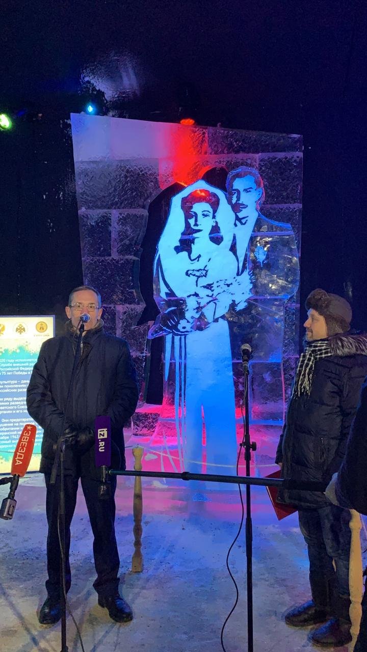 Необычная композиция, изображающая знаменитых супругов в момент свадьбы 1946 года, создана в рамках V Новогоднего фестиваля «Ледовая Москва». Мероприятие приурочено к 100-летию Службы внешней разведки РФ и 75-летию со Дня Победы в Великой Отечественной войне.