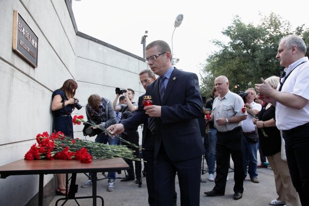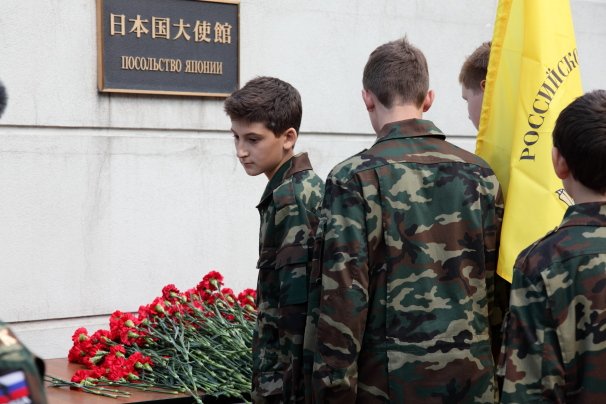 Члены РВИО также возложили цветы у Посольства Японии в Москве (Грохольский переулок, д. 27) в память о многочисленных жертвах атомных бомбардировок городов Хиросима и Нагасаки. При поддержке благотворительного фонда «Ратники Отечества» в церемонии возложения цветов сегодня приняли участие школьники из Подмосковья: участники клуба «Юный разведчик» из Дмитровского района, ученики Школы №5 из г. Железнодорожный, активисты клуба «Рекрут» из г. Реутов и другие.