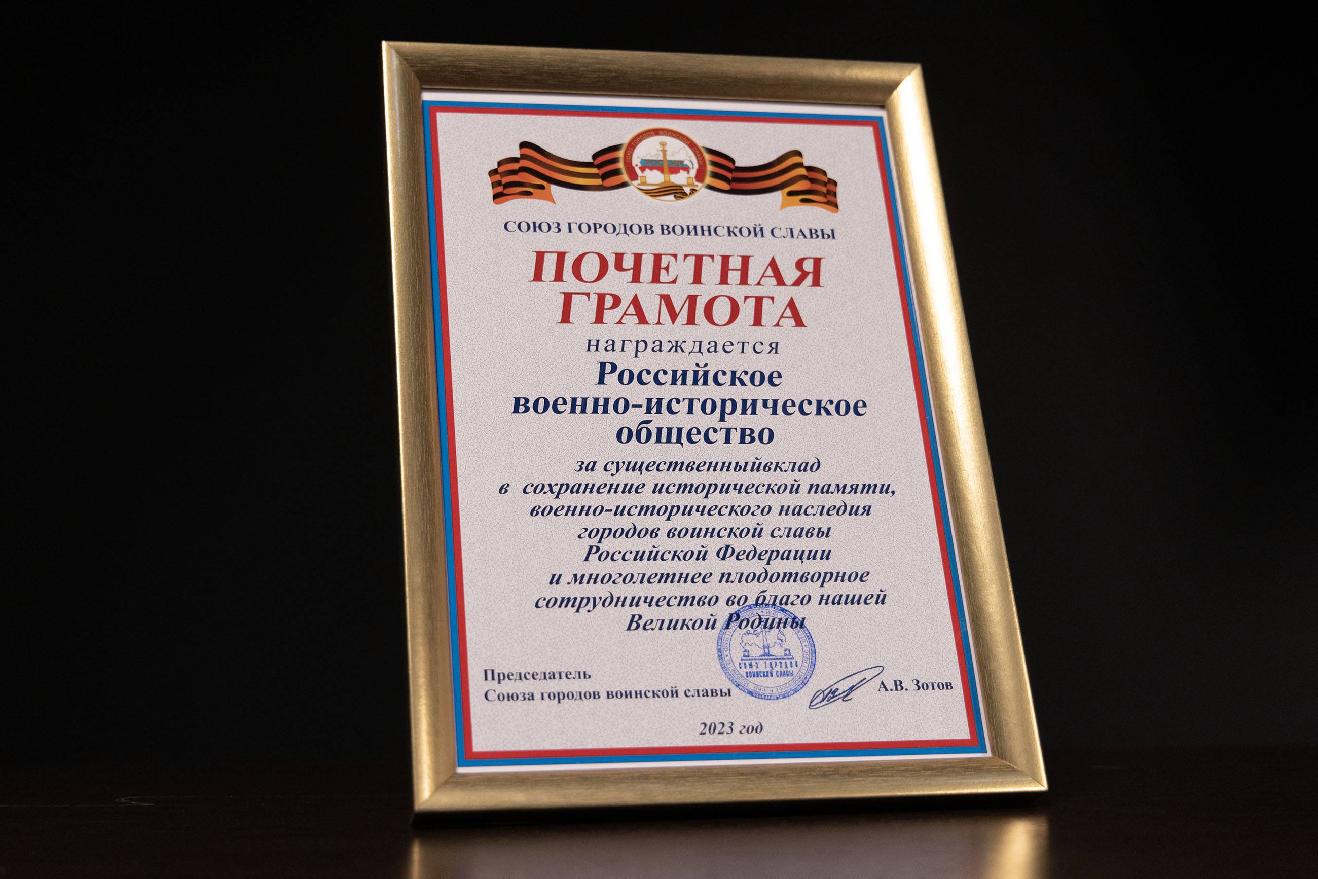 Кроме того, Российское военно-историческое общество было отмечено Почетной Грамотой за существенный вклад в сохранение исторической Памяти, военно-исторического наследия Городов воинской славы Российской Федерации и многолетнее плодотворное сотрудничество с Союзом Городов Воинской Славы.