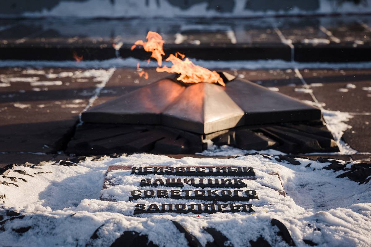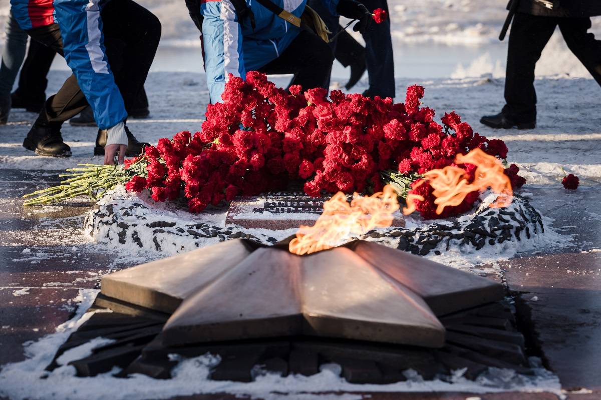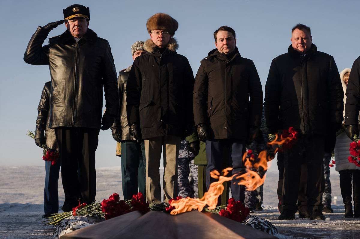 Участники акции «Выстрел памяти» возложили цветы к Вечному огню у подножия монумента Защитникам Заполярья и почтили память погибших за Родину минутой молчания.