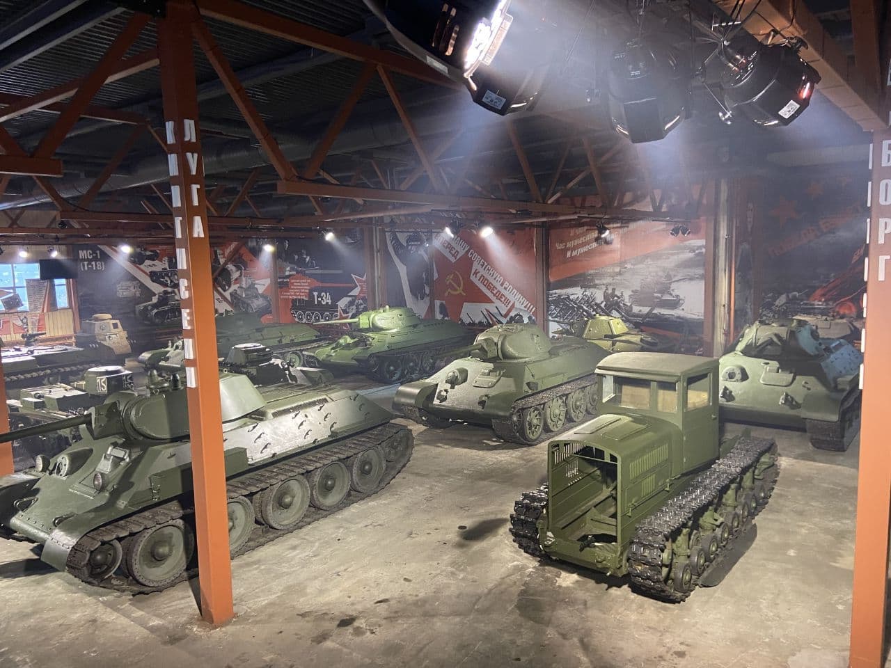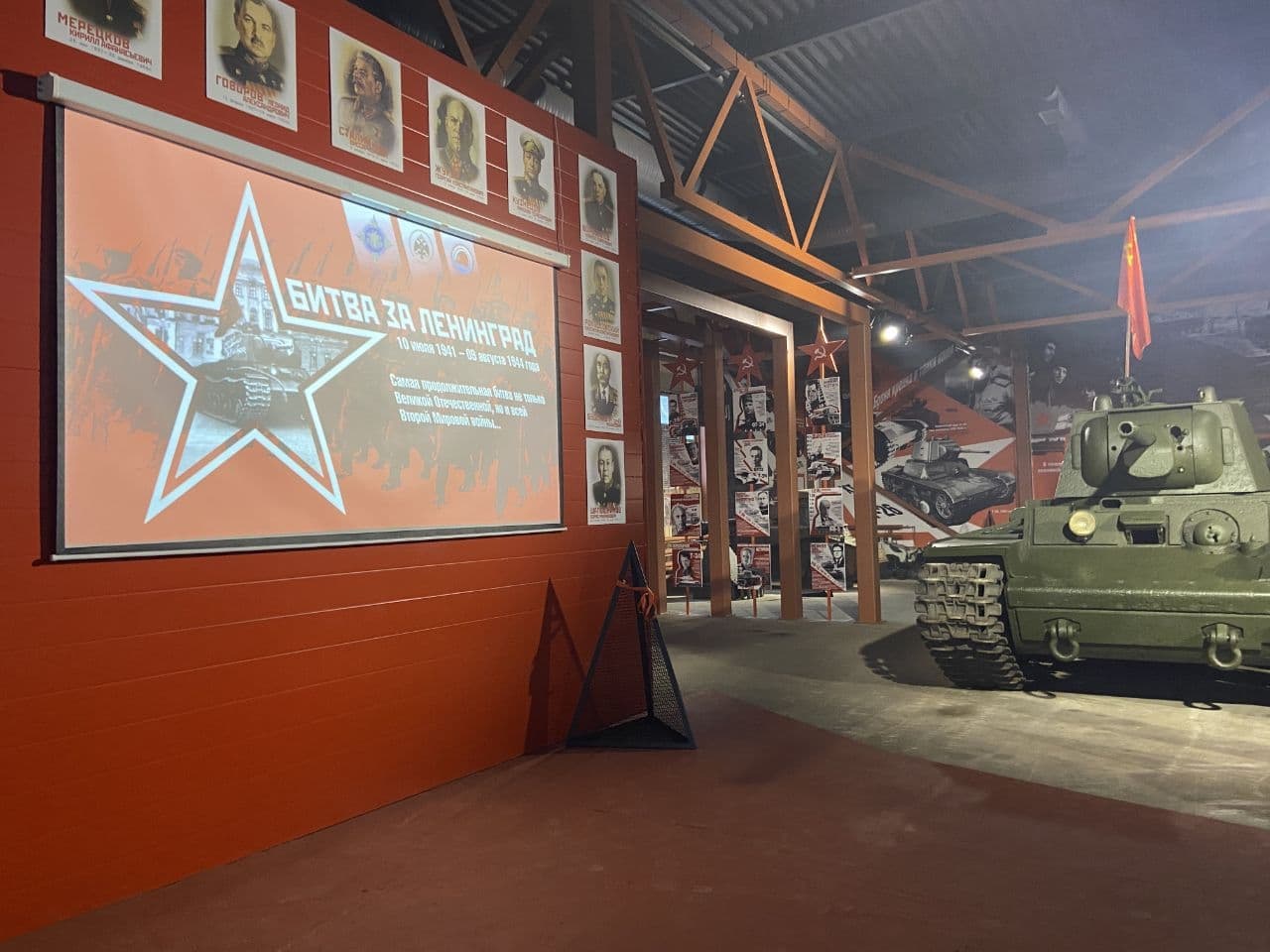 В экспозиции представлены более 30 уникальных образцов тяжелой техники: танки КВ-1, Т-34-76 различных модификаций, Т-60, Т-70, плавающие танки Т-38, экспозицию дополняют гусеничные тягачи, тракторы и предметы вооружения времен Великой Отечественной войны, редкие фортификационные сооружения. Отдельная часть выставки посвящена советским инженерам-танкостроителям, героям-танкистам, их судьбам. В ходе экскурсии гостям рассказали не только о технических характеристиках, но и об уникальных историях этих боевых машин, известных судьбах экипажей. Почти все экспонаты были обнаружены поисковиками на местах сражений Битвы за Ленинград, отреставрированы специалистами музея, большинство из них на ходу.