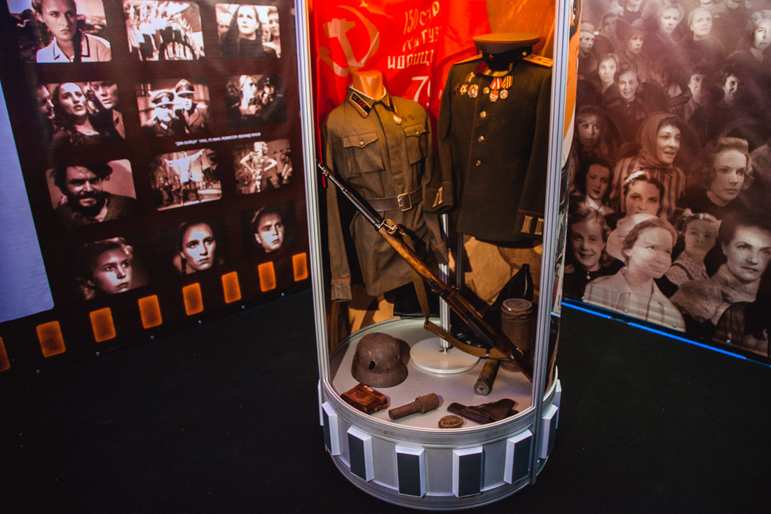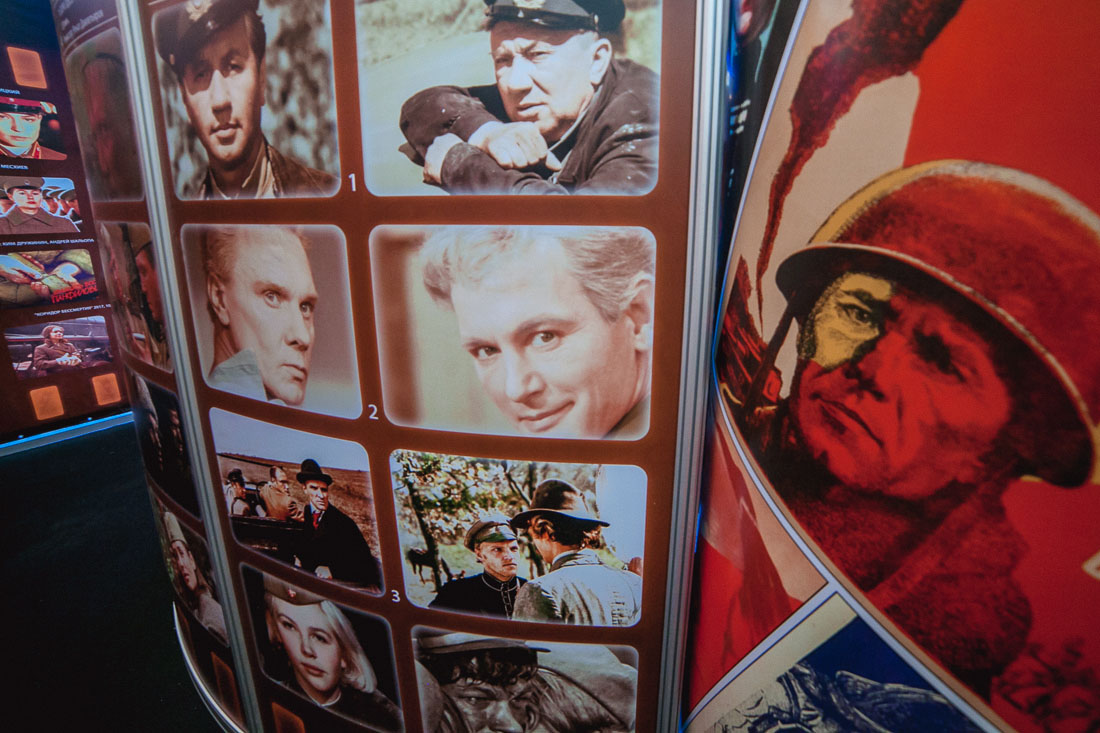 Кроме фотокадров из любимых кинолент здесь продемонстрированы образцы формы и вооружения времен Великой Отечественной войны, а также установлен проектор экрана для трансляции военных фильмов.