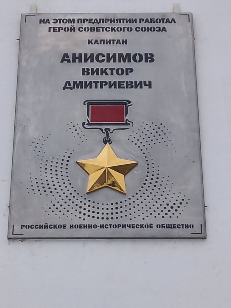 Памятный знак установлен Российским военно-историческим обществом на фасаде здания бывшего нефтеперерабатывающего завода, где Виктор Анисимов работал слесарем.