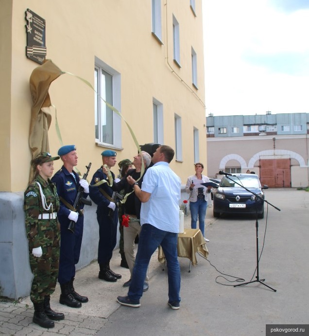 Почетное право открыть доску было предоставлено депутату Псковской гордумы Сергею Колосову и председателю регионального отделения Российского военно-исторического общества Александру Голышеву.