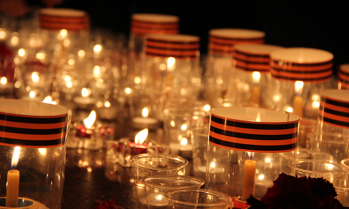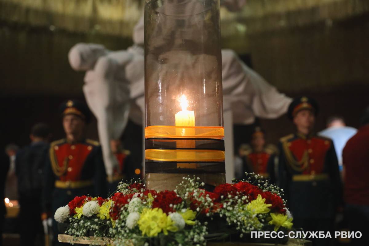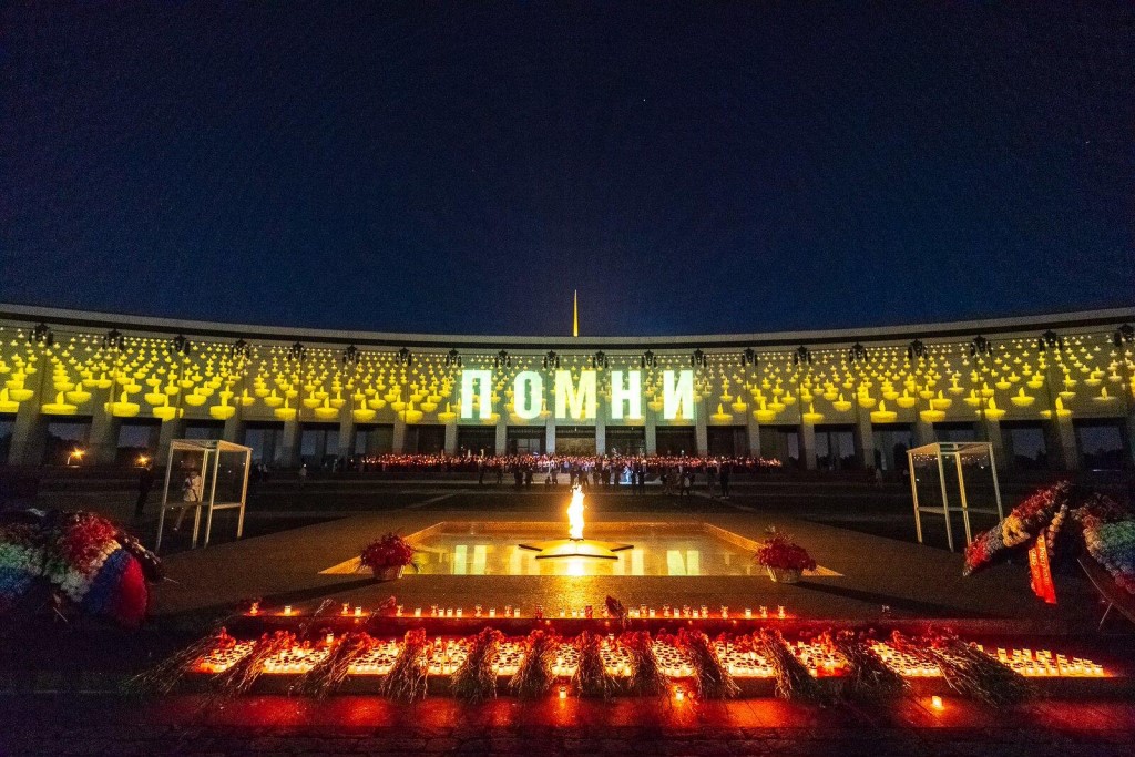 Одновременно на фасад Музея Победы будет спроецирована грандиозная свето-звуковая инсталляция – изображение 1418 свечей. Звуковое сопровождение мемориальной акции обеспечит ансамбль Росгвардии, а также артисты Театра музыки и поэзии под руководством Народной артистки России Елены Камбуровой.