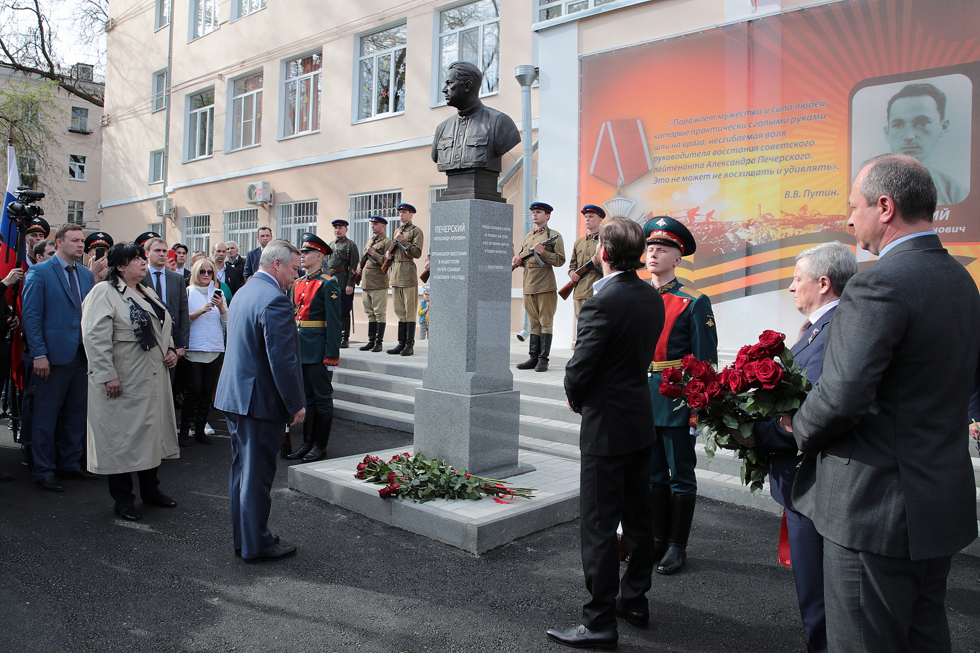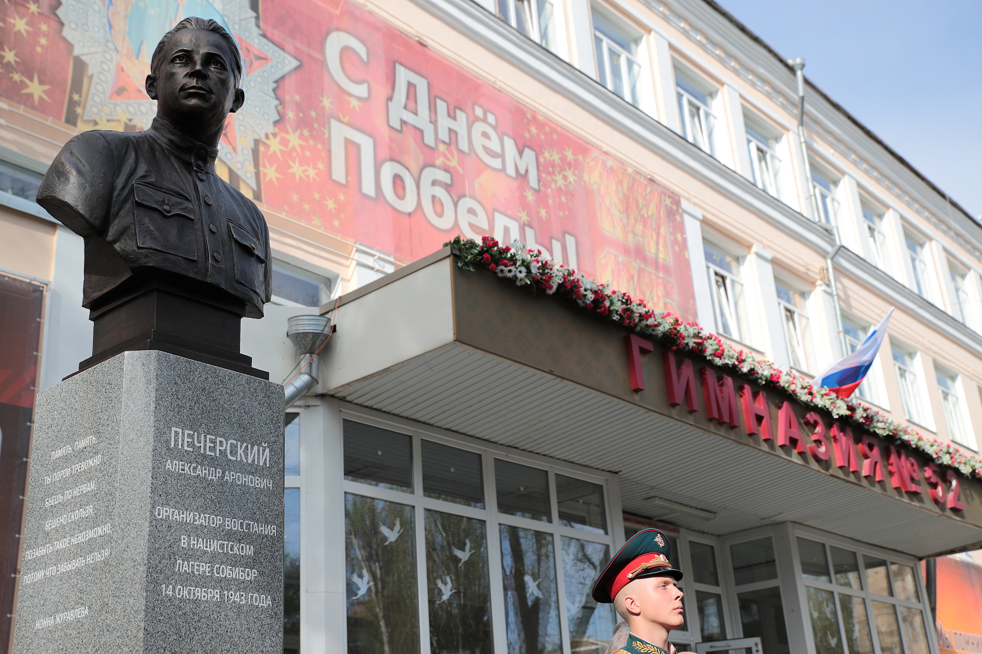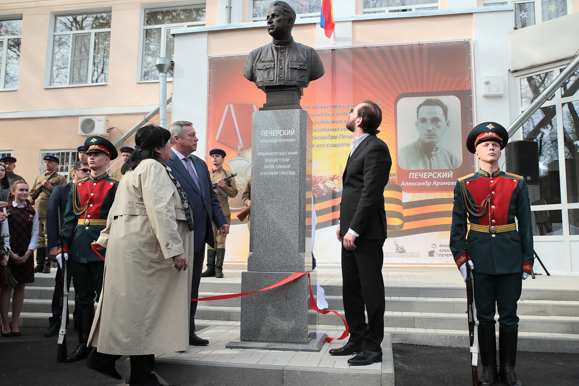 Сегодня в Ростове-на-Дону на площади перед гимназией №52 торжественно открыт памятник-бюст офицеру Красной Армии Александру Печерскому, руководившему единственным успешным массовым побегом из фашистского лагеря смерти «Собибор» в годы Великой Отечественной войны.