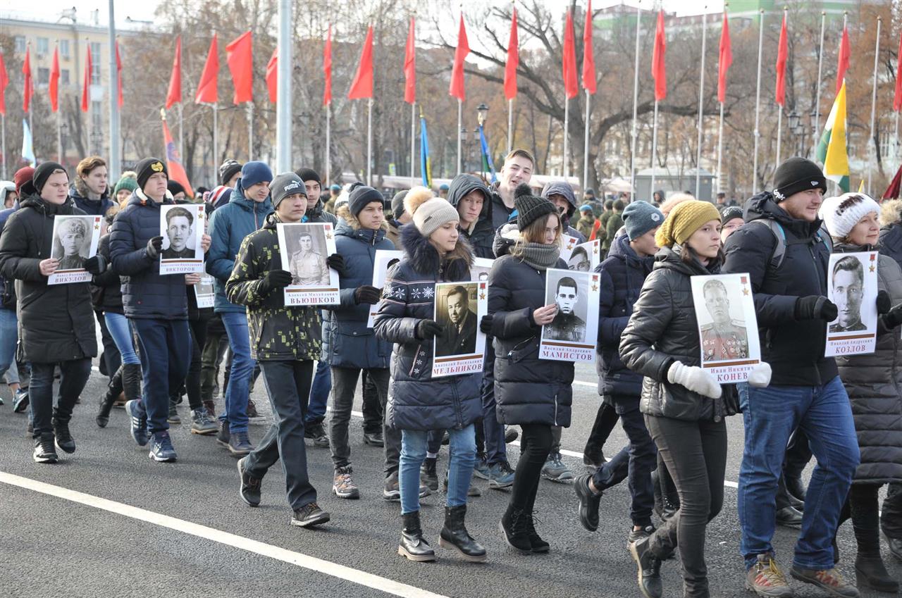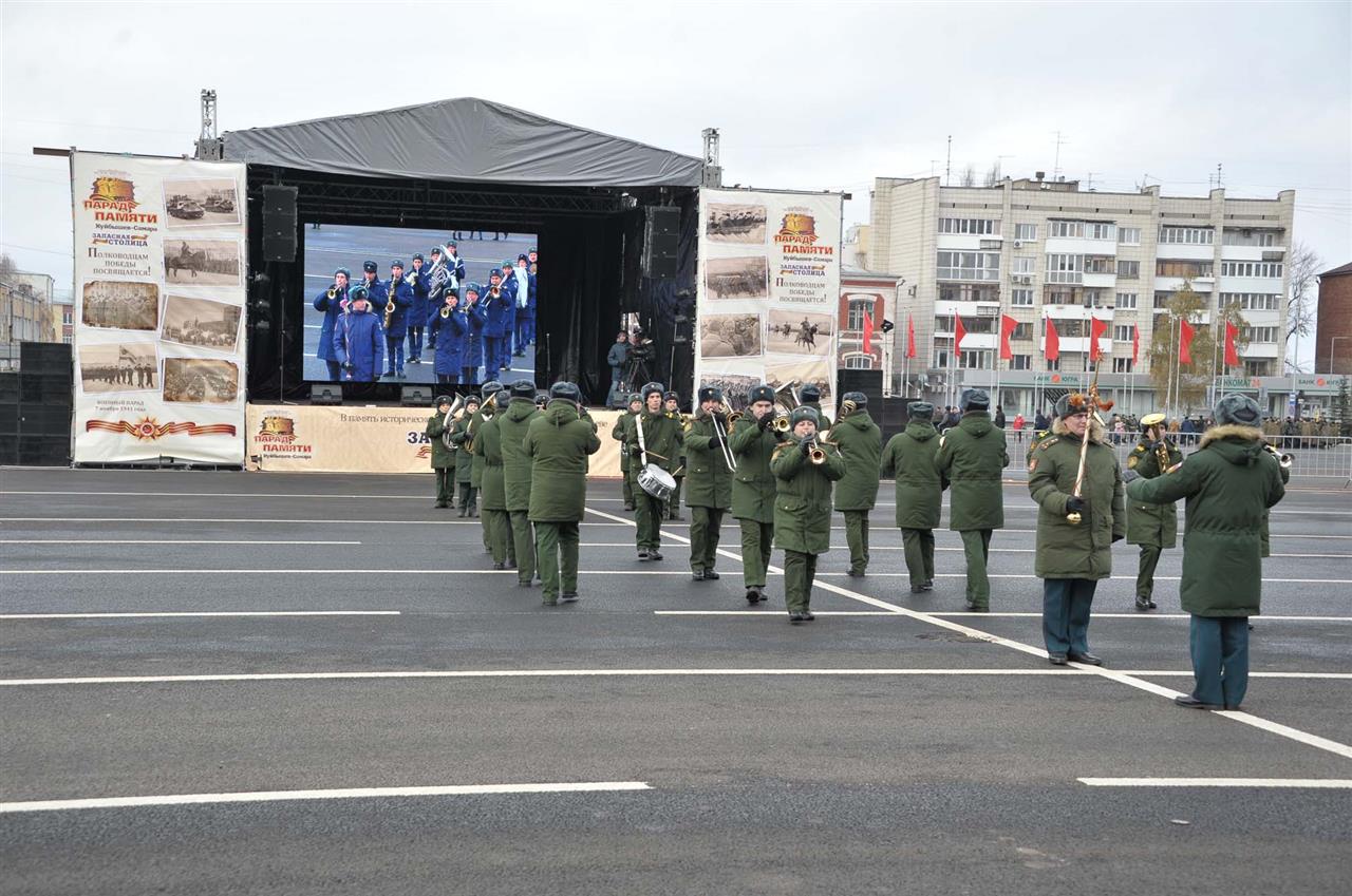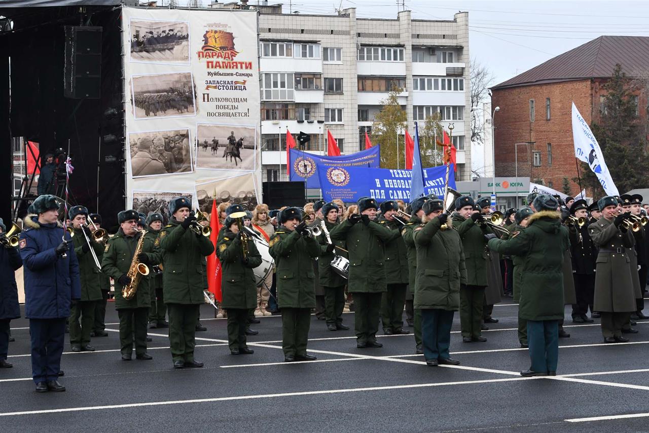 Парад Памяти начался с торжественного внесения на главную площадь города государственного флага России, копии знамени Победы, а также боевых знамен 65-й и 415-й стрелковых дивизий, которые в начале Великой Отечественной войны были сформированы на Дальнем Востоке и транзитом через Куйбышев отправлялись на фронт. 7 ноября 1941-го именно они и шествовали по площади им. Куйбышева.