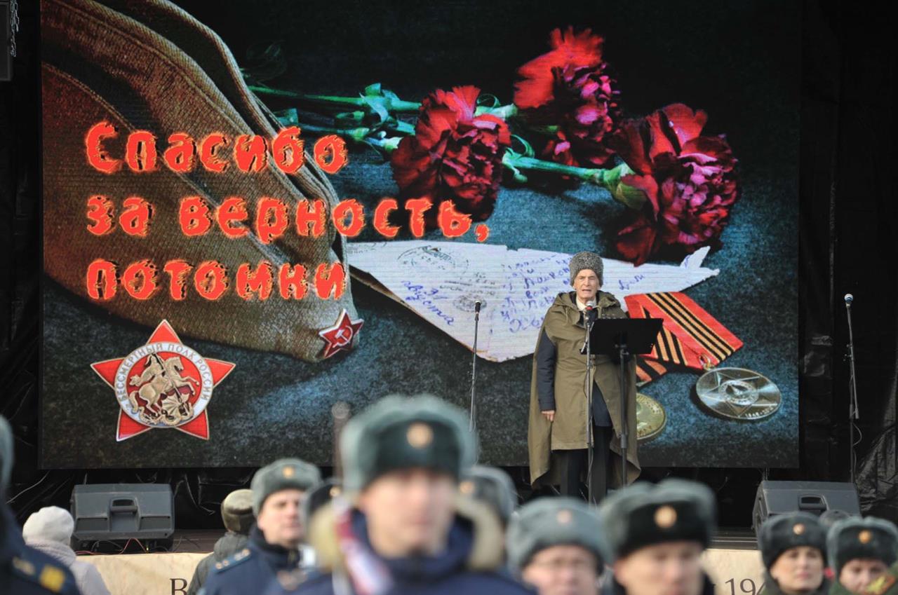 Отдельным строем прошел Геройский полк, участники которого нести фотографии Героев Великой Отечественной войны. Настоящим символом Парада Памяти в Самаре стал народный артист СССР Василий Лановой, который, прочитал стихи военных лет.