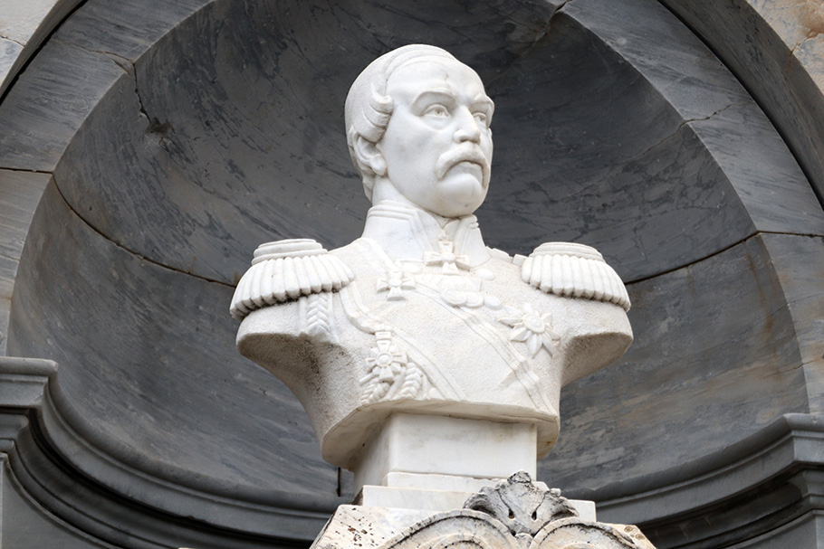 Граф Эдуард Иванович Тотлебен (1818–1884) – российский военачальник, военный инженер, генерал-адъютант почетный гражданин города Севастополя. Во время обороны Севастополя 1854-1855 гг. — начальник инженерной службы Севастопольского гарнизона. По проектам Тотлебена и под его руководством были построены большинство укреплений Севастополя и велась подземно-минная война. Талант Тотлебена полностью раскрылся в ходе Кавказской, Крымской и Русско-турецкой (1877–1878 гг.) войн. Отмечен самыми высшими наградами Российской империи, в том числе Орденом Святого Андрея Первозванного с Бриллиантовыми знаками к нему и орденами Святого Георгия 2–4-й степеней. Был временно похоронен в часовне-мавзолее на кладбище у лютеранской церкви в Курляндии, в Кедайняе. По повелению императора Александра III перезахоронен на Братском кладбище в Севастополе.