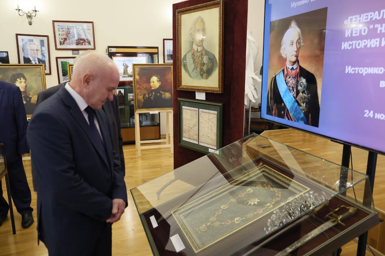 В жизни Александра Васильевича Суворова отразился важный этап истории России и становления Российского Государства. Ощутить особый дух исторических событий, связанных с именем великого русского полководца, помогают представленные в рамках проекта подлинные предметы, свидетели эпохи. Экскурсию по выставке для почетных гостей провел Руководитель Музейно-выставочного центра Тамбовской области, Председатель Совета Регионального отделения РВИО Игорь Николаев.
