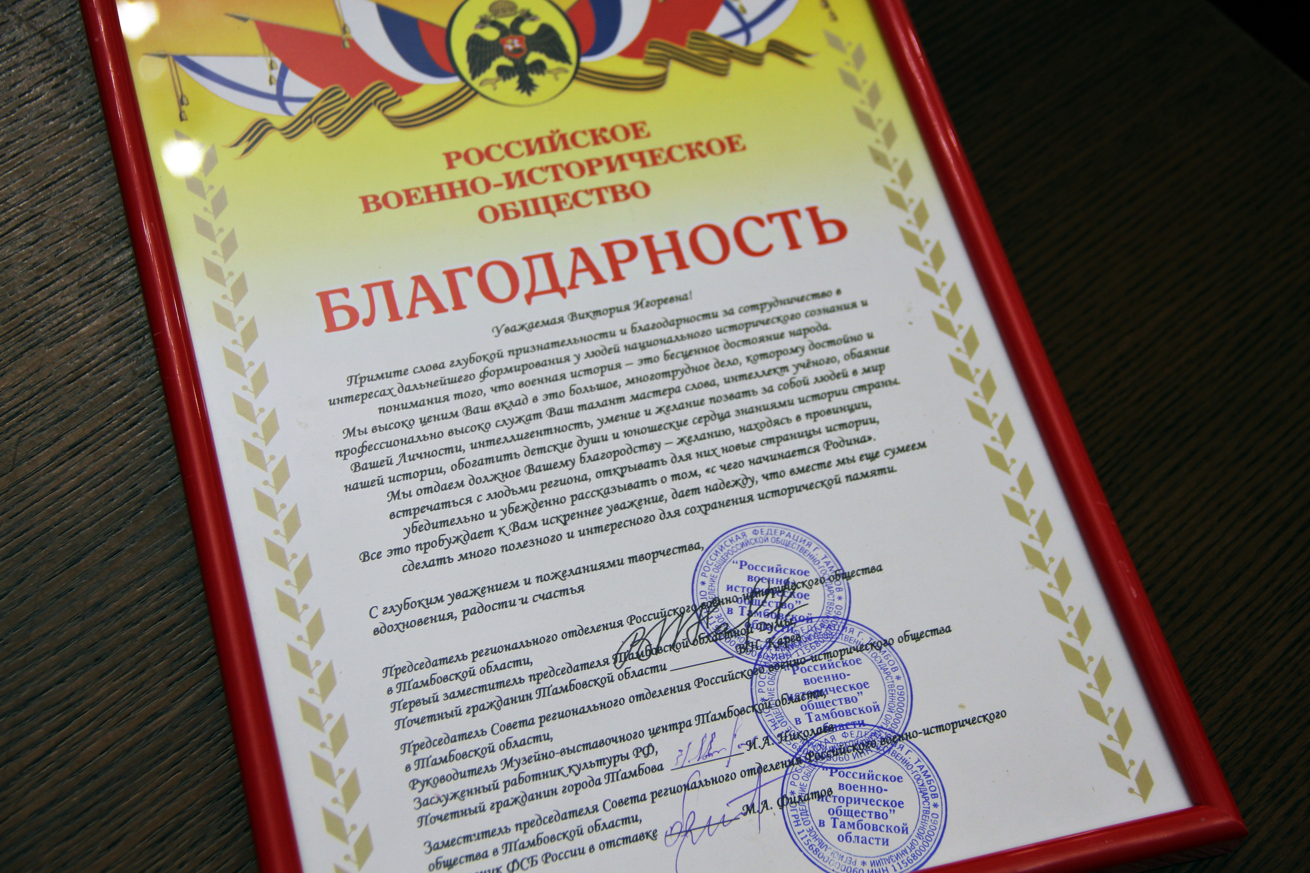 Председатель тамбовского отделения РВИО, Первый заместитель Председателя Тамбовской областной Думы Владимир Карев отмечает, что жизненный опыт все больше убеждает в том, что не только нашему, но и последующим поколениям очень необходимо трепетное отношения к Родине, к людям войны, труда, а также понятиям «честь», «достоинство», «преданность Родине».