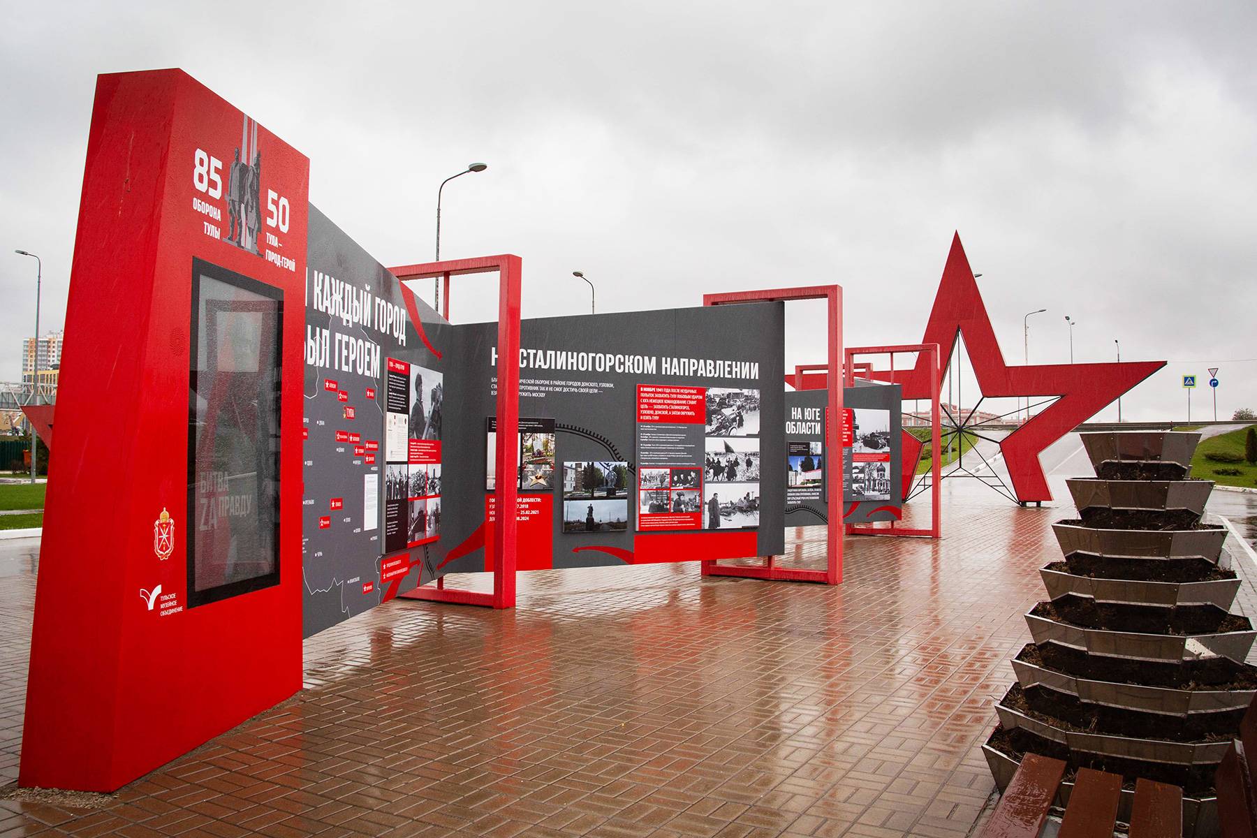 «И каждый город был героем» – уличная выставка, созданная Тульским региональным отделением РВИО и Тульским музейным объединением, рассказывает о жителях небольших населенных пунктов Тульской области, которые в 1941 году героически приняли на себя удар немецко-фашистских захватчиков. Экспозиция напоминает о подвиге защитников деревни Кострово Алексинского района, где 5 декабря 1941 года были разгромлены 3-я и 4-я танковые дивизии армии Гудериана, что не позволило врагу окружить Тулу. Отдельный раздел посвящен обороне станции Горбачёво Плавского района – стратегического железнодорожного узла, через который проходил основной поток воинских эшелонов. Также представлена история сел и деревень Арсеньевского района, где защитники Родины сражались до июля 1943 года, не давая противнику перебросить силы к Сталинграду. Экспозиция дополнена материалами о системе региональных почетных званий «Город воинской доблести», «Населенный пункт воинской доблести» и «Рубеж воинской доблести», учрежденных в 2015 году.