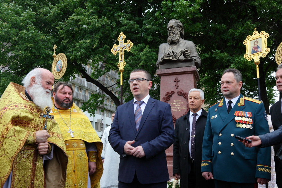 – Сегодня у нас большой праздник, мы вспоминаем великого хирурга и святителя. Его наследие как хирурга долгое время было предано забвению, потому что в советское время он находился в оппозиции, был преследуем - 20 лет лагерей, ссылки, допросы пытки. При всем этом он сохранял милосердие даже к своим мучителям и любовь к ближним. Документально зафиксирован случай, когда во время иркутской ссылки с помощью подручных инструментов в асептических условиях на кухне он спас жизнь ребенку, проведя уникальную операцию по пересадке почки... Всю свою жизнь он работал и верил Богу, и Бог ему всегда помогал - иначе такие чудеса не были бы возможны… Научные и богословские труды Валентина Феликсовича Войно-Ясенецкого стали сегодня нам доступны - наше историческое наследие реанимируется. Россия возрождается с помощью учителей и докторов, врачующих дух и тело, - сказал Начальник ФГБУ «3 Центральный военный клинический госпиталь им. А.А. Вишневского» Министерства обороны Российской Федерации Александр Есипов.