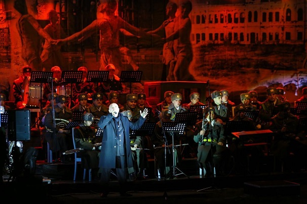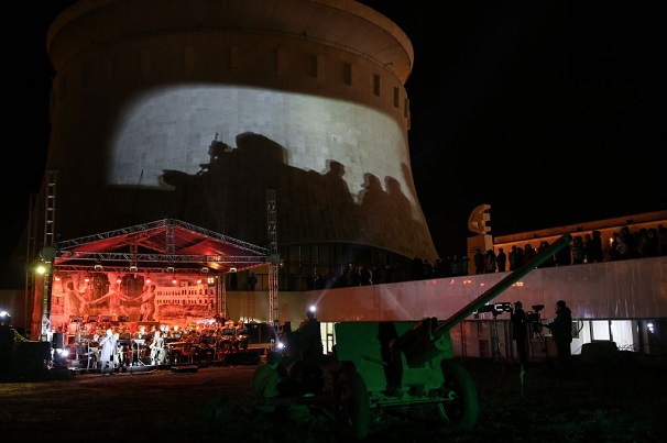 Исполнил произведение, никогда ранее не звучавшее в Волгограде, сводный военный духовой оркестр 20-й стрелковой бригады ВС РФ под управлением заслуженного работника культуры России дирижера Михаила Титова. Музыку органично дополнили документальные хроники из архива музея-заповедника «Сталинградская битва». Кадры значимых событий из жизни города проецировались на здание музея-панорамы с помощью специального оборудования.