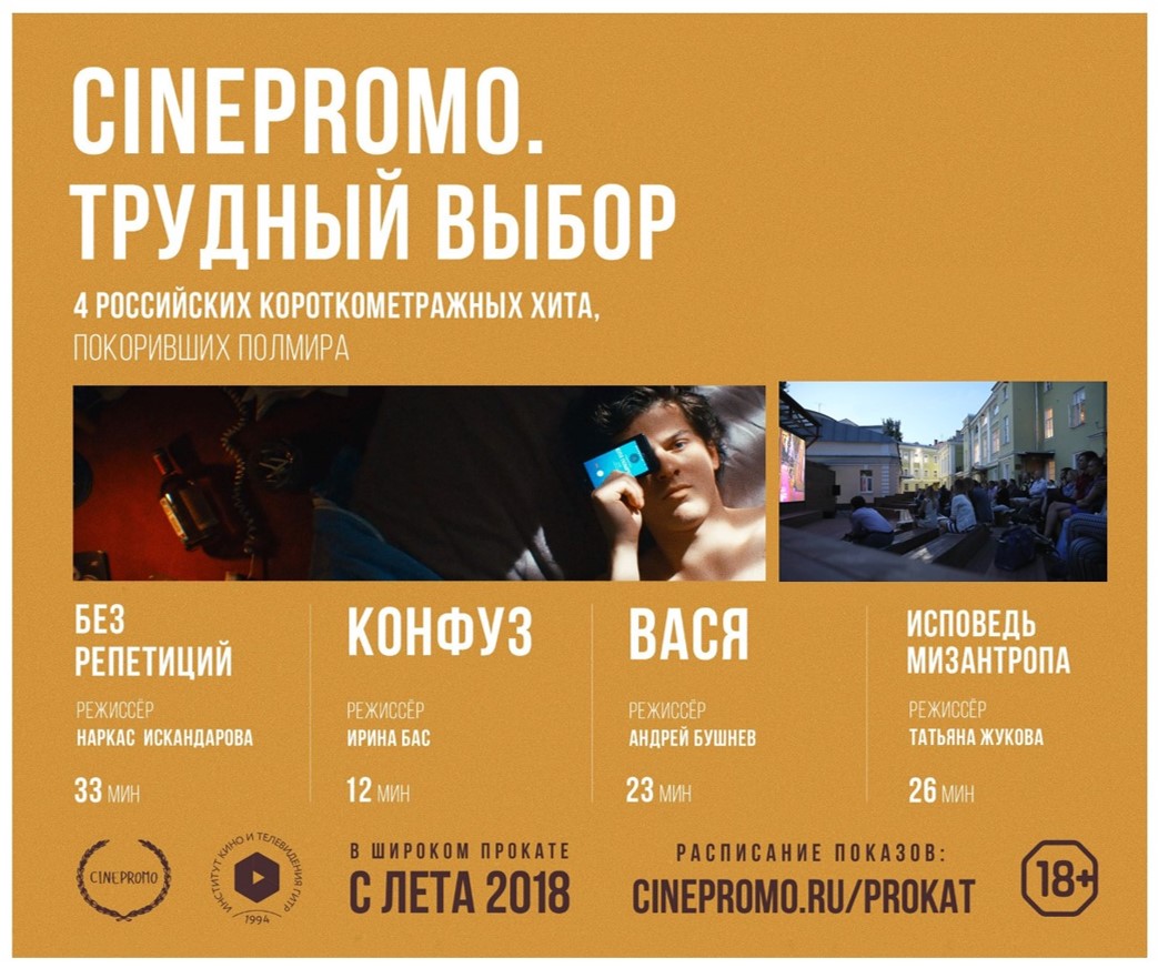 В КиноСквере РВИО продолжается серия показов картин короткого метра CinePromo. В рамках вечера представлен цикл фильмов «Трудный выбор». Знакомство с необычными произведениями российского кинематографа, покорившими полмира, творческие встречи с их авторами – все это ждёт гостей вечера. В этот раз зрители познакомятся с фильмами: «Без репетиций» (реж. Наркас Искандарова), «Конфуз» (реж. Ирина Бас), «Вася» (реж. Андрей Бушнев) и «Исповедь мизантропа» (реж. Татьяна Жукова).
