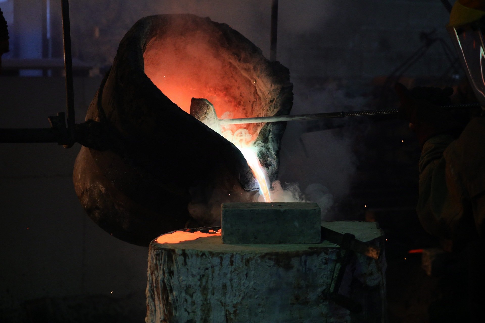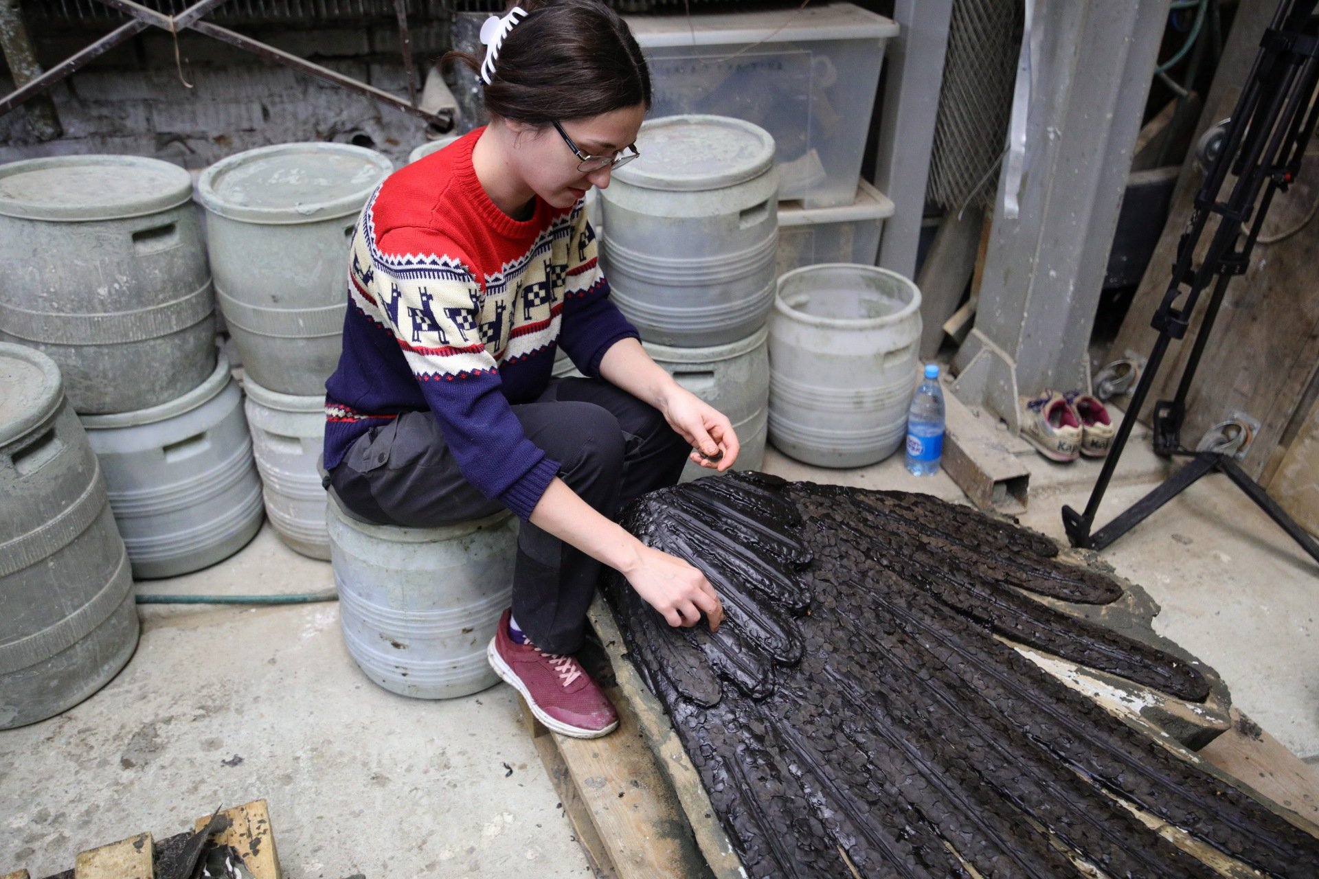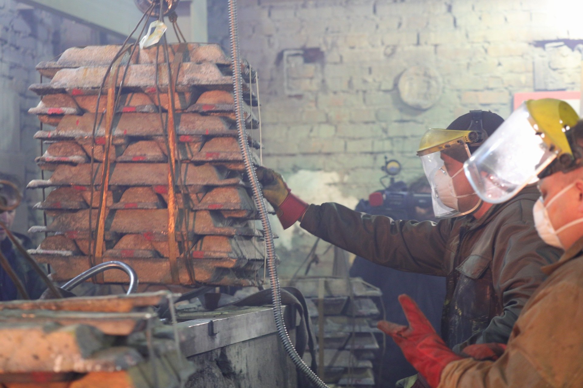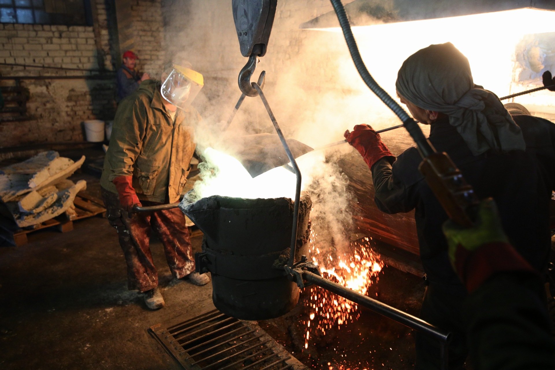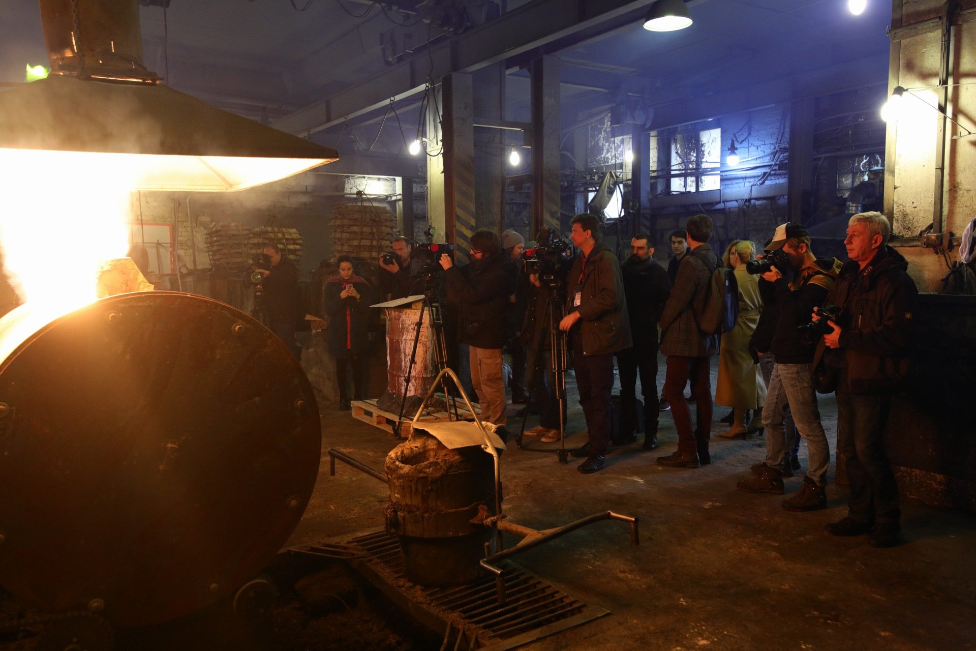 Гости цеха, расположенного в подмосковном Солнечногорске, стали свидетелями процесса отливки бронзовых элементов памятника. Первоначально 25-метровая скульптура солдата была вылеплена из глины, формована и разделена на 600 частей, которые отливают по отдельности, а затем соберут воедино. Слитки бронзы загружают в печь, где при температуре около 1200 градусов они плавятся до жидкого состояния. Затем детали соединяют в более крупные элементы. Важнейшая часть скульптуры - лик солдата уже готова.