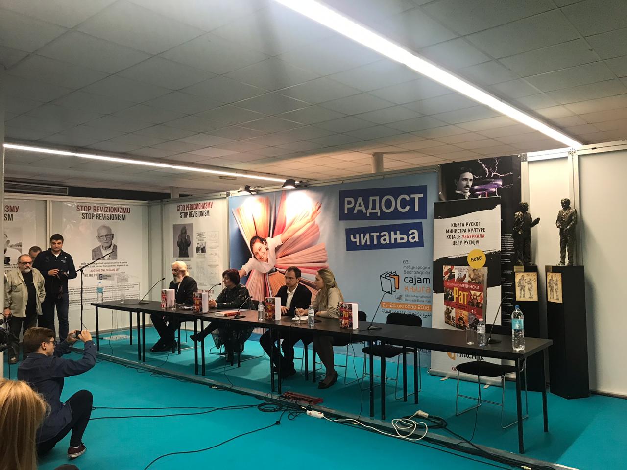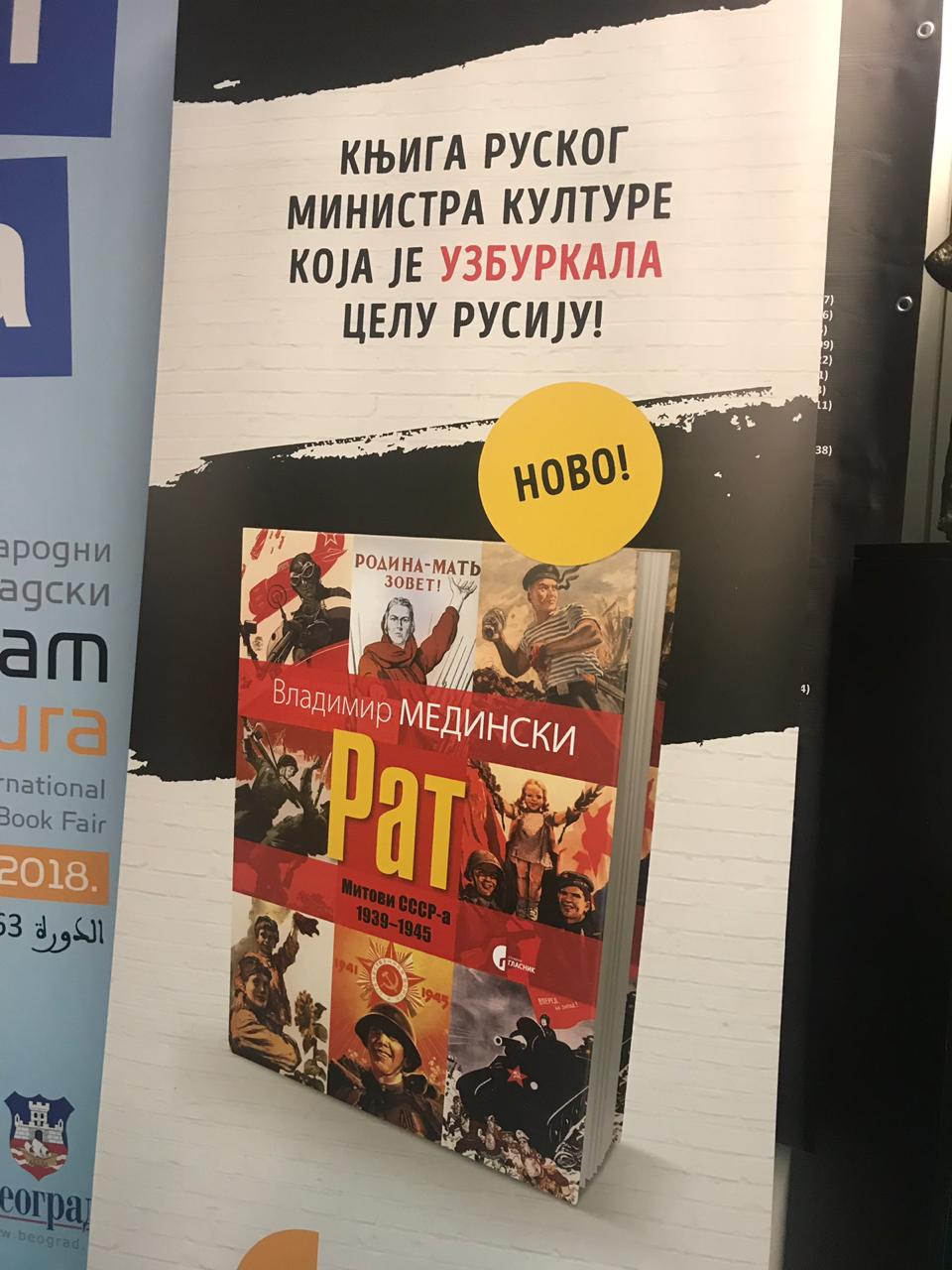 Министр культуры Российской Федерации, председатель Российского военно-исторического общества Владимир Мединский представил на Белградской книжной ярмарке свою книгу «Война. Мифы СССР. 1939–1945» на сербском языке. Он напомнил, что она была написана 10 лет назад и вышла в 2009 году в канун 70-летия со дня начала Второй мировой войны.