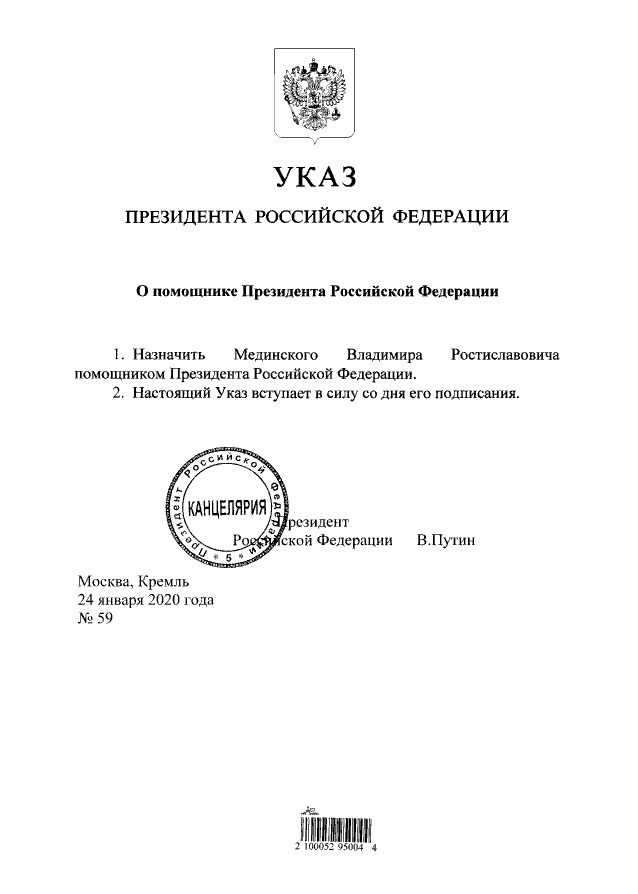 - Назначить Мединского Владимира Ростиславовича помощником Президента Российской Федерации, - говорится в Указе №59 от 24 января 2020 года.