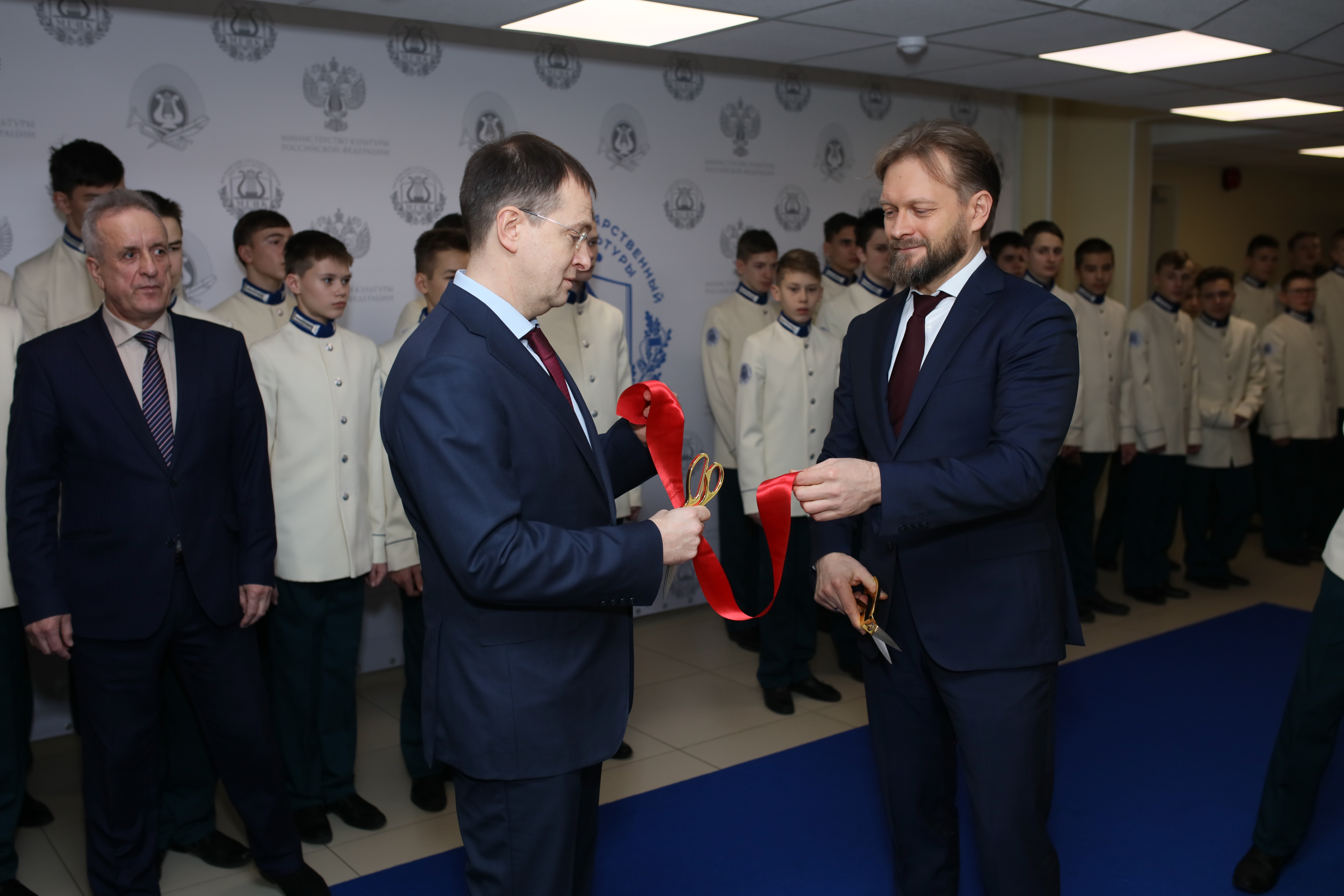 Сегодня в подмосковных Химках состоялась торжественная церемония открытия нового здания Музыкального кадетского лицея Московского государственного института культуры имени А.В. Александрова. Участие в мероприятии принял и.о. Министра культуры РФ, Председатель Российского военно-исторического общества Владимир Мединский.