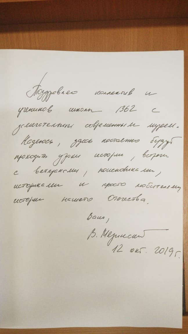 Сегодня в московской школе №1362 состоялось открытие обновленного Музея боевой славы второй дивизии Народного ополчения. В церемонии принял участие Министр культуры РФ, Председатель Российского военно-исторического общества Владимир Мединский, который является выпускником этой школы.