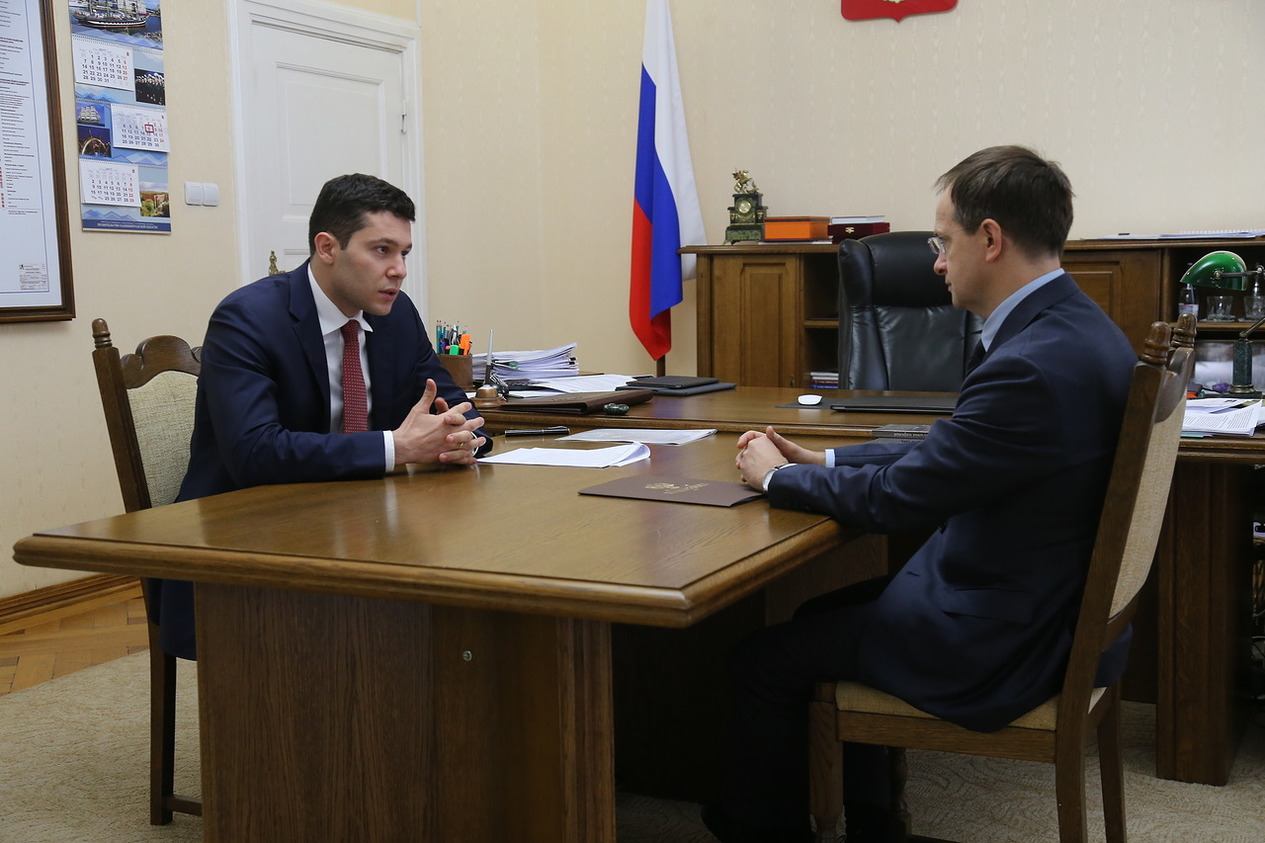 Сегодня Министр культуры Российской Федерации, Председатель Российского военно-исторического общества Владимир Мединский провел рабочую встречу с временно исполняющим обязанности губернатора Калининградской области Антоном Алихановым.
