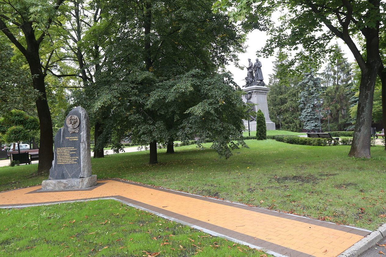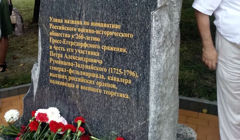 Генерал-фельдмаршал Петр Румянцев (1725 – 1796), кавалер высших российских орденов, нанеся неожиданный удар прусским войскам, переломил ход Гросс-Егерсдорфской битвы и обеспечил победу русской армии в одном из ключевых сражений Семилетней войны 1756-1763 годов. В ходе этой войны русские войска заняли территорию Восточной Пруссии, которая стала частью Российской Империи, а жители королевства принесли присягу на верность российской императрице Елизавете Петровне. Стела в честь Петра Румянцева была торжественно открыта РВИО на пересечении Гвардейского проспекта и улицы Петра Румянцева (бывшая Горная) в августе 2017 года. Еще один памятный знак, посвященный 260-летию битвы при Гросс-Егерсдорфе установлен у места сражения – в 3 км к югу от посёлка Междуречье Черняховского городского округа Калининградской области. А на въезде и выезде из поселка Междуречье стоят жёлтые информационные дорожные знаки, указывающие на границы исторического поля боя.