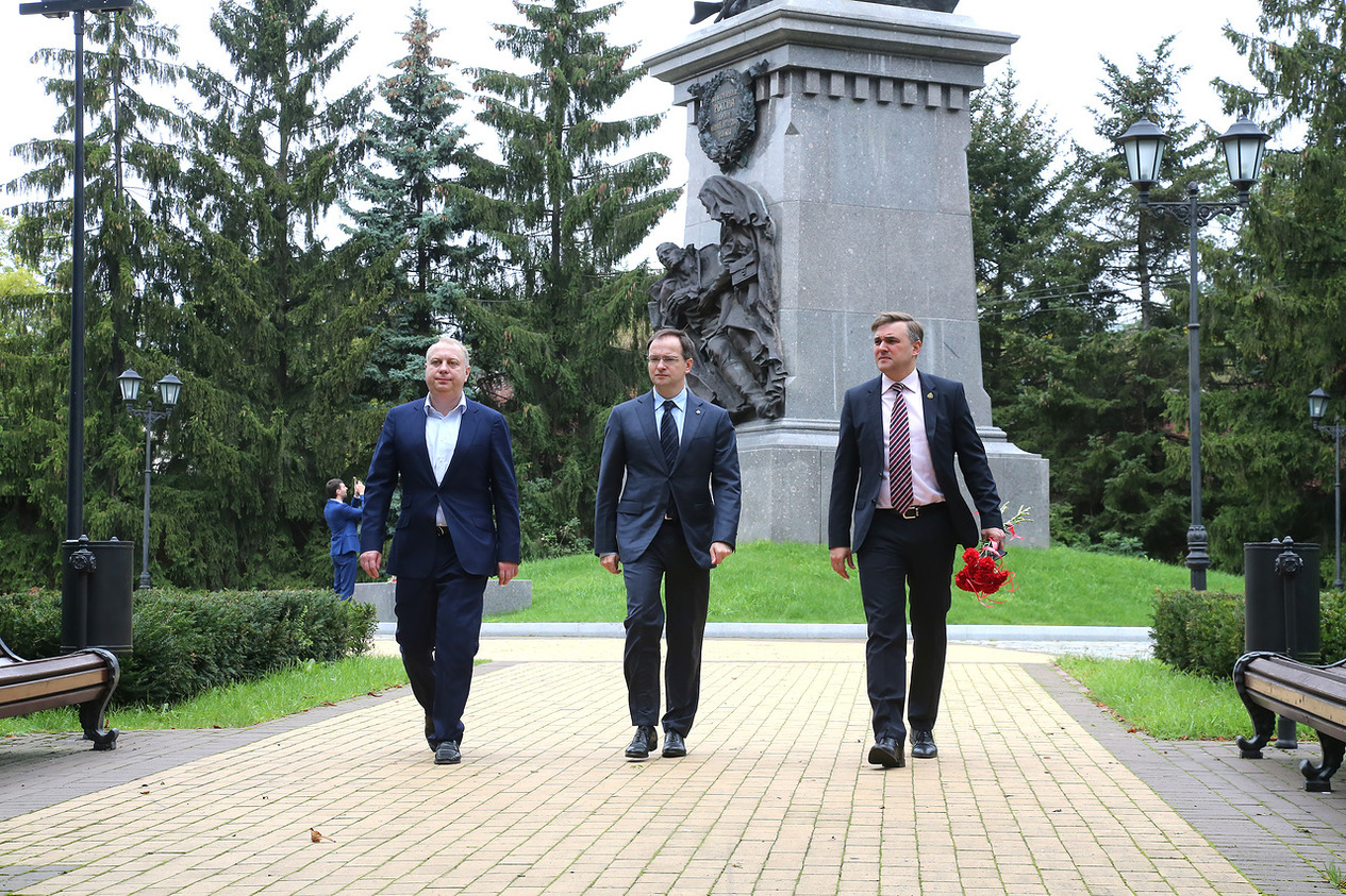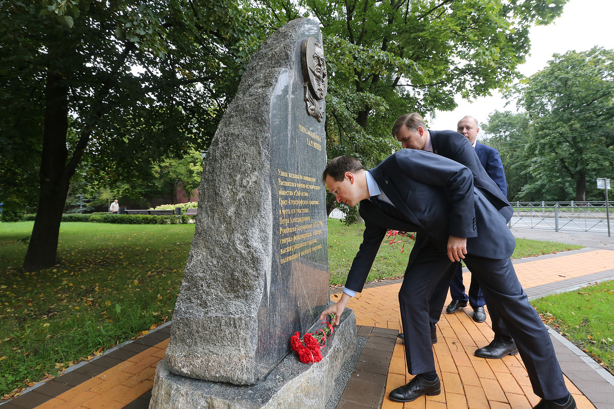 Владимир Мединский возложил цветы к стеле военачальника Петра Александровича Румянцева (улица Горная Калининграда была недавно переименована в улицу Румянцева) ипамятнику Героям Первой мировой войны. Оба мемориала установлены в Калининграде Российским военно-историческим обществом.