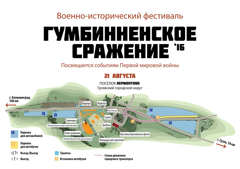 21 августа 2016 в 14:00 в пос. Лермонотово Калининградской области состоится торжественное открытие военно-исторического фестиваля «Гумбинненское сражение», организованного Российским военно-историческим обществом (РВИО) при поддержке МЧС России и Правительства Калининградской области. В церемонии примут участие Министр культуры России, Председатель РВИО Владимир Мединский; Полномочный представитель Президента в Северо-Западном Федеральном округе Николай Цуканов; врио губернатора Калининградской области Евгений Зиничев; врио Председателя Правительства Калининградской области Антон Алиханов.