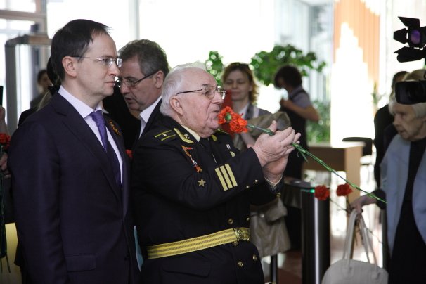 Владимир Мединский встречал и поздравлял ветеранов в фойе Минкультуры, где накануне Дня Победы начали работу выставки «Мы помним, мы чтим» и «Эхо войны», на которых представлены личные вещи и фотографии участников Великой Отечественной войны, работавших в аппаратах Министерств культуры СССР, РСФСР и Госкино СССР и РСФСР.