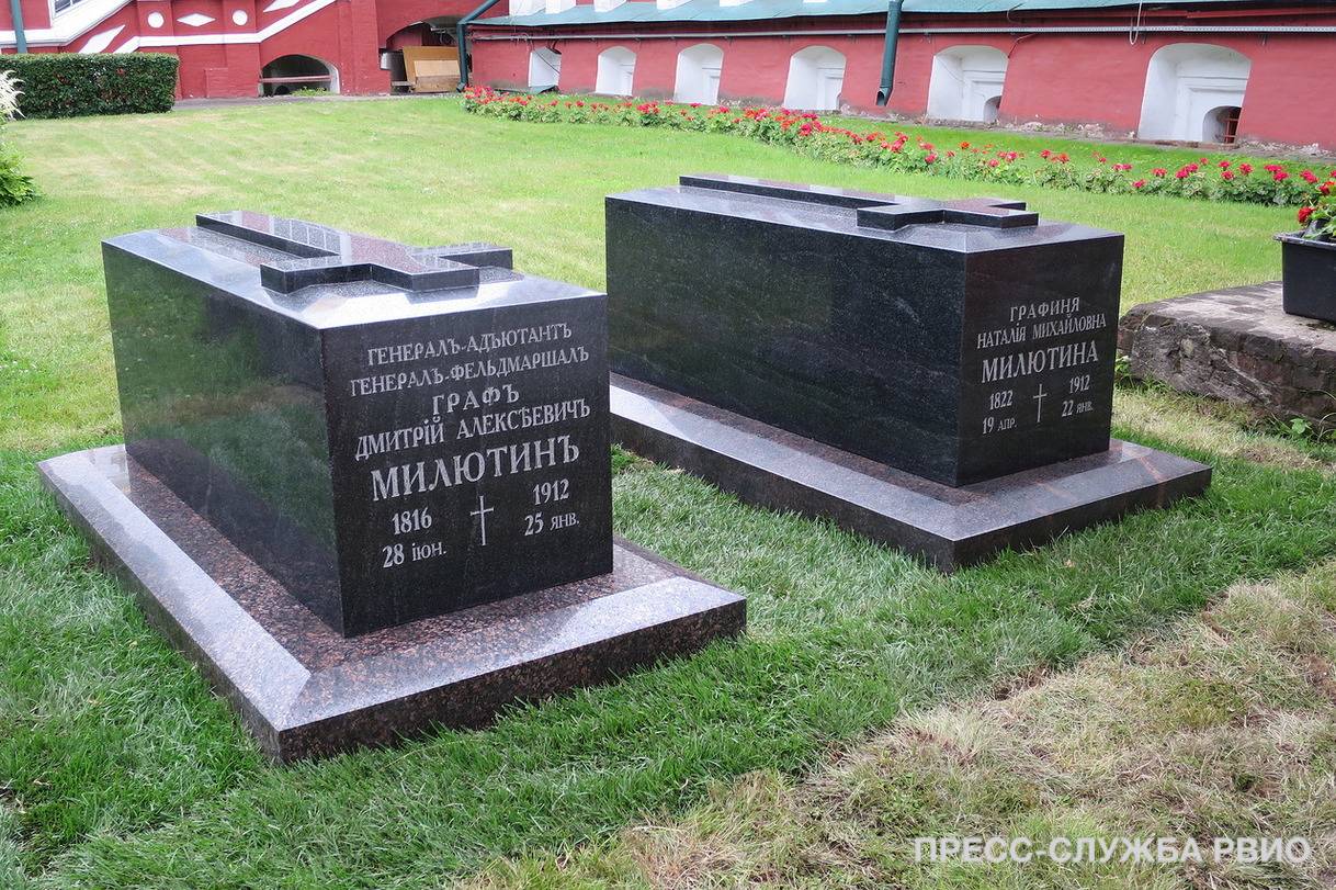 Милютин ушел из жизни в своем крымском имении Симеиз, всего на два дня пережив горячо любимую жену (они прожили вместе 69 лет). Супруги обрели вечный покой на Новодевичьем кладбище, неподалеку от Успенского храма. В 1930-е годы надгробия были утрачены. После публикаций в «Российской газете» и журнале «Родина» Министр культуры РФ, Председатель РВИО Владимир Мединский принял решение о восстановлении надгробий Дмитрия Алексеевича и его супруги. На основании сохранившихся архивных фотографий, Российское военно-историческое общество осуществило воссоздание мемориальных надгробий. В 2016 году в преддверии 200-летия со Дня рождения генерал-фельдмаршала Дмитрия Милютина историческая справедливость была восстановлена.