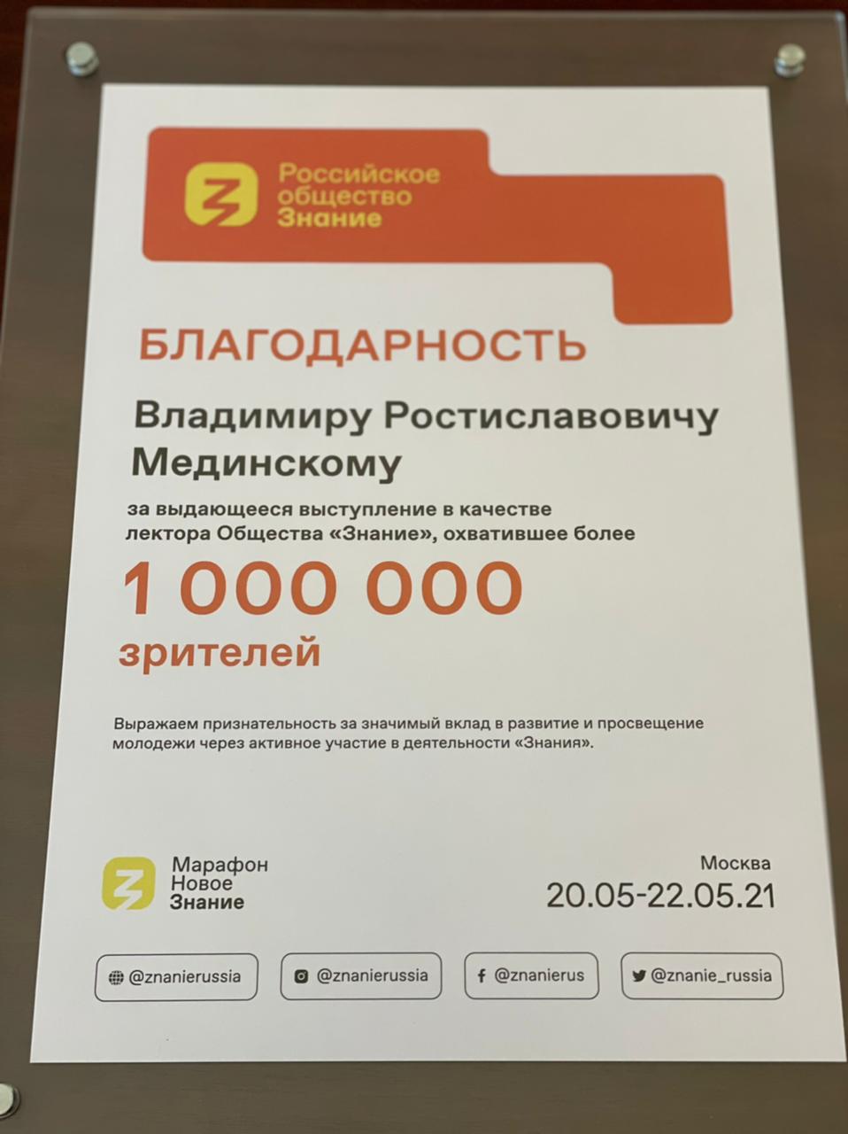 По итогам марафона «Новое знание», организованного Российским обществом «Знание» в мае 2021 года, Помощник Президента России, Председатель Российского военно-исторического общества Владимир Мединский стал одним из наиболее популярных лекторов, чье выступление набрало более миллиона просмотров.
