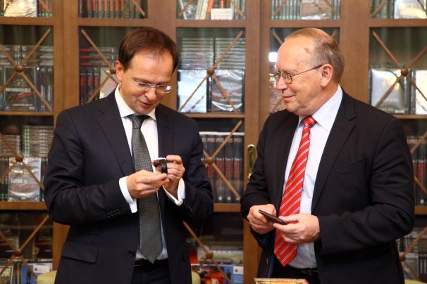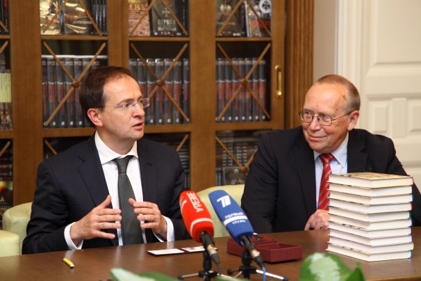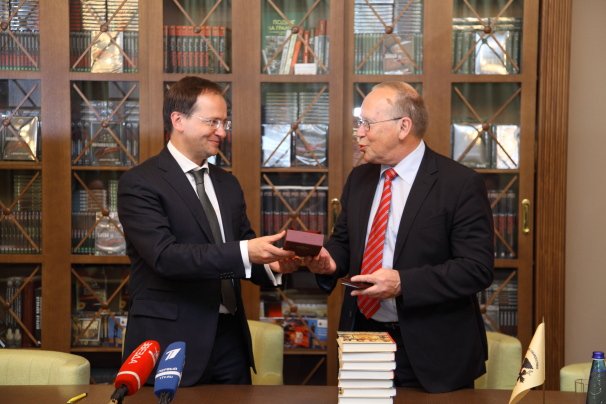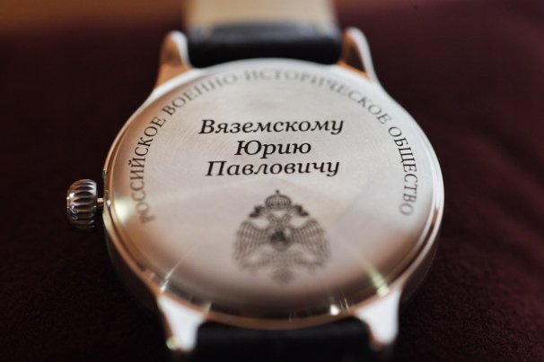 Сегодня состоялась встреча Председателя Российского военно-исторического общества, Министра Культуры Российской Федерации Владимира Мединского с писателем и телеведущим, Заслуженным работником культуры Российской Федерации Юрием Вяземским. Встреча началась с торжественного вручения Юрию Вяземскому удостоверения почетного члена Российского военно-исторического общества и памятных часов с гравировкой (точную реплику офицерских наградных часов 1943 года).